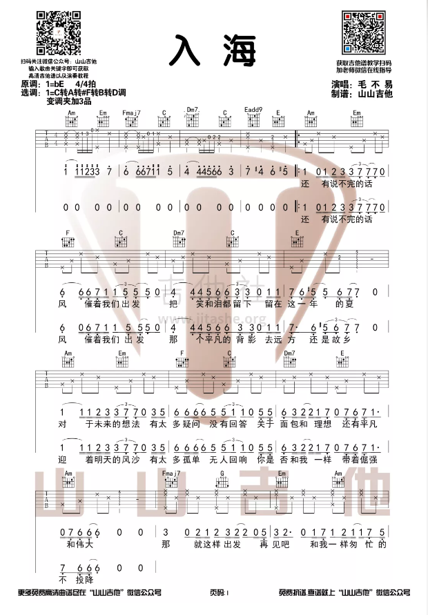 《入海》吉他谱-毛不易-原版吉他谱-C调弹唱谱...