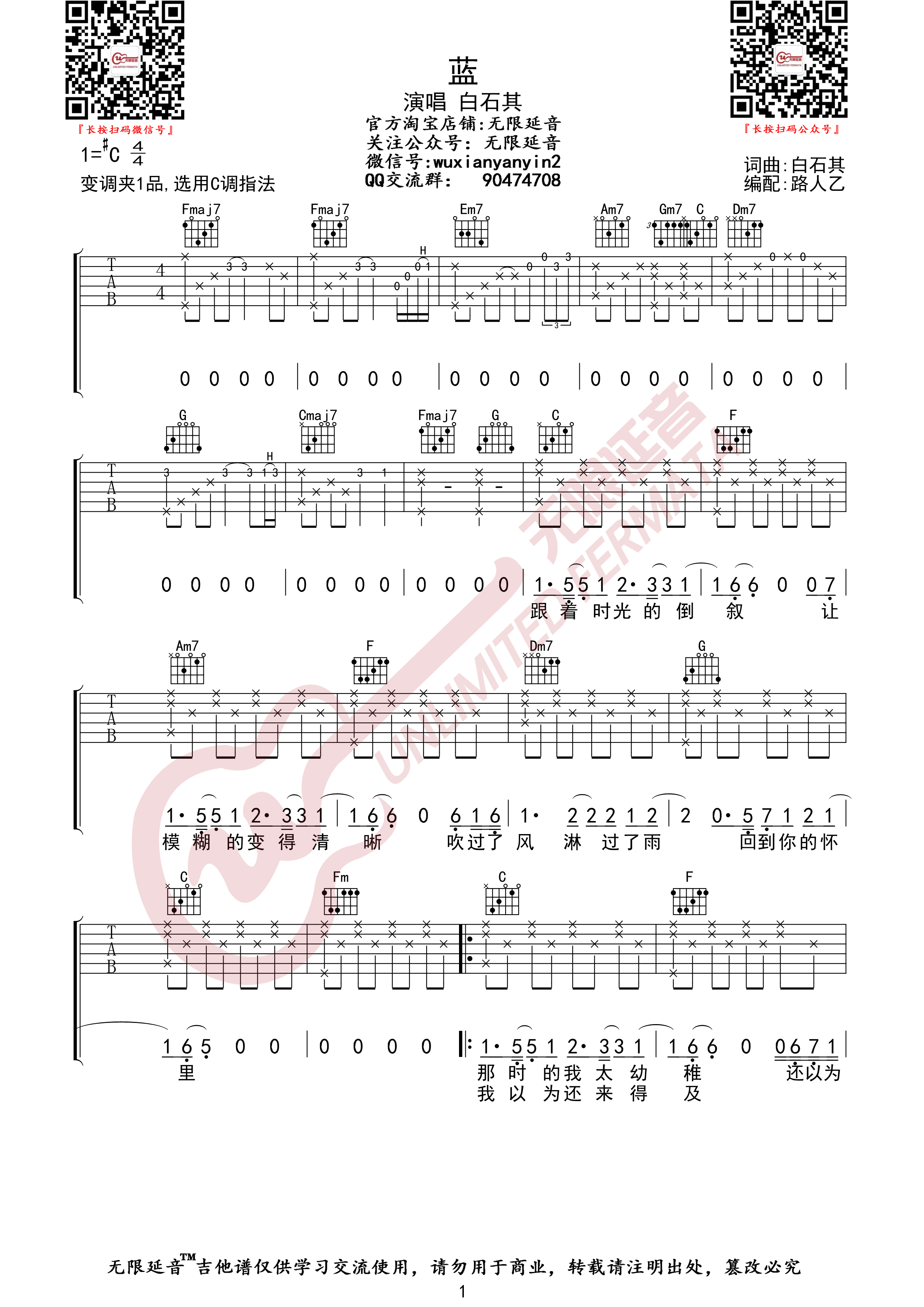 蓝吉他谱-白石其-C调六线谱弹唱变调夹1品...
