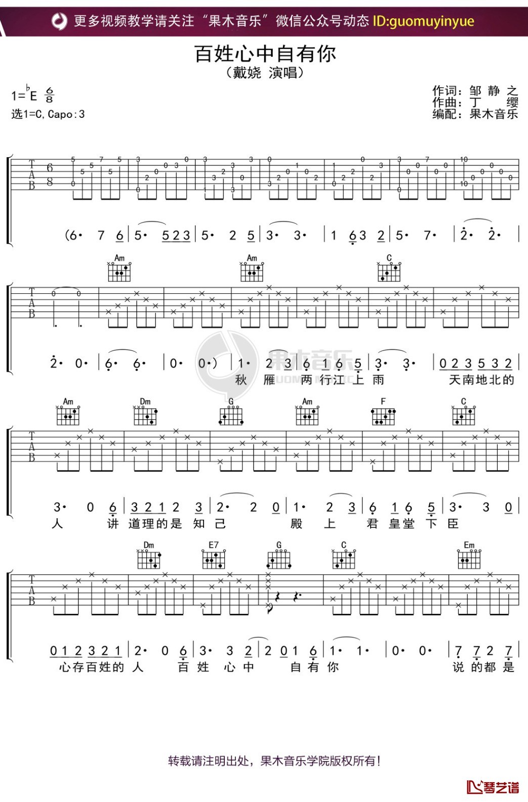 吉他《百姓心中自有你》戴娆/韩甜甜-吉他谱 C调弹唱六线谱
