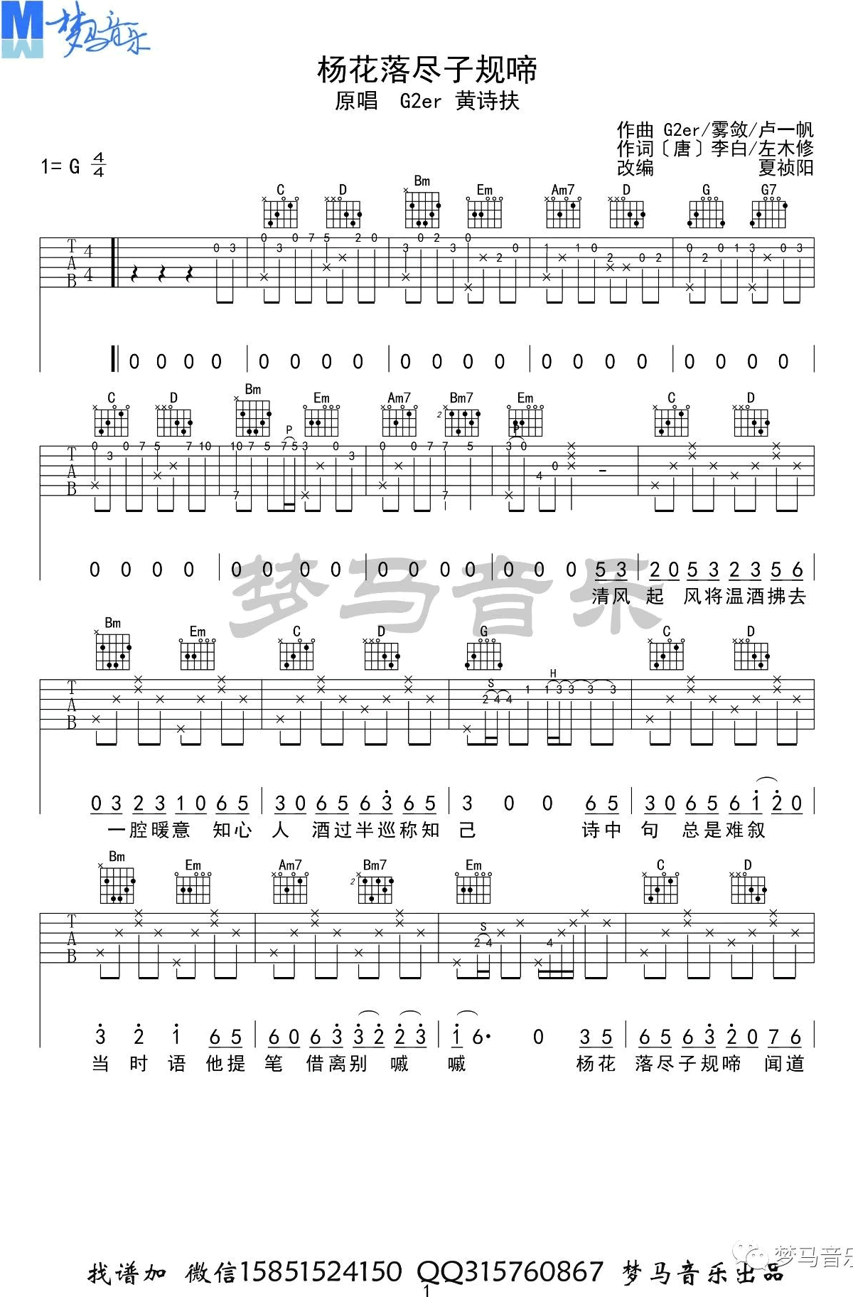 《杨花落尽子规啼》吉他谱_G2er/黄诗扶_G调原版弹唱谱_高清六线谱分享,《杨花落尽子规啼》是由G2er/黄诗扶演唱的一首古风歌曲,这首歌歌名出自李白的《闻王昌龄左迁龙标遥有此寄》...