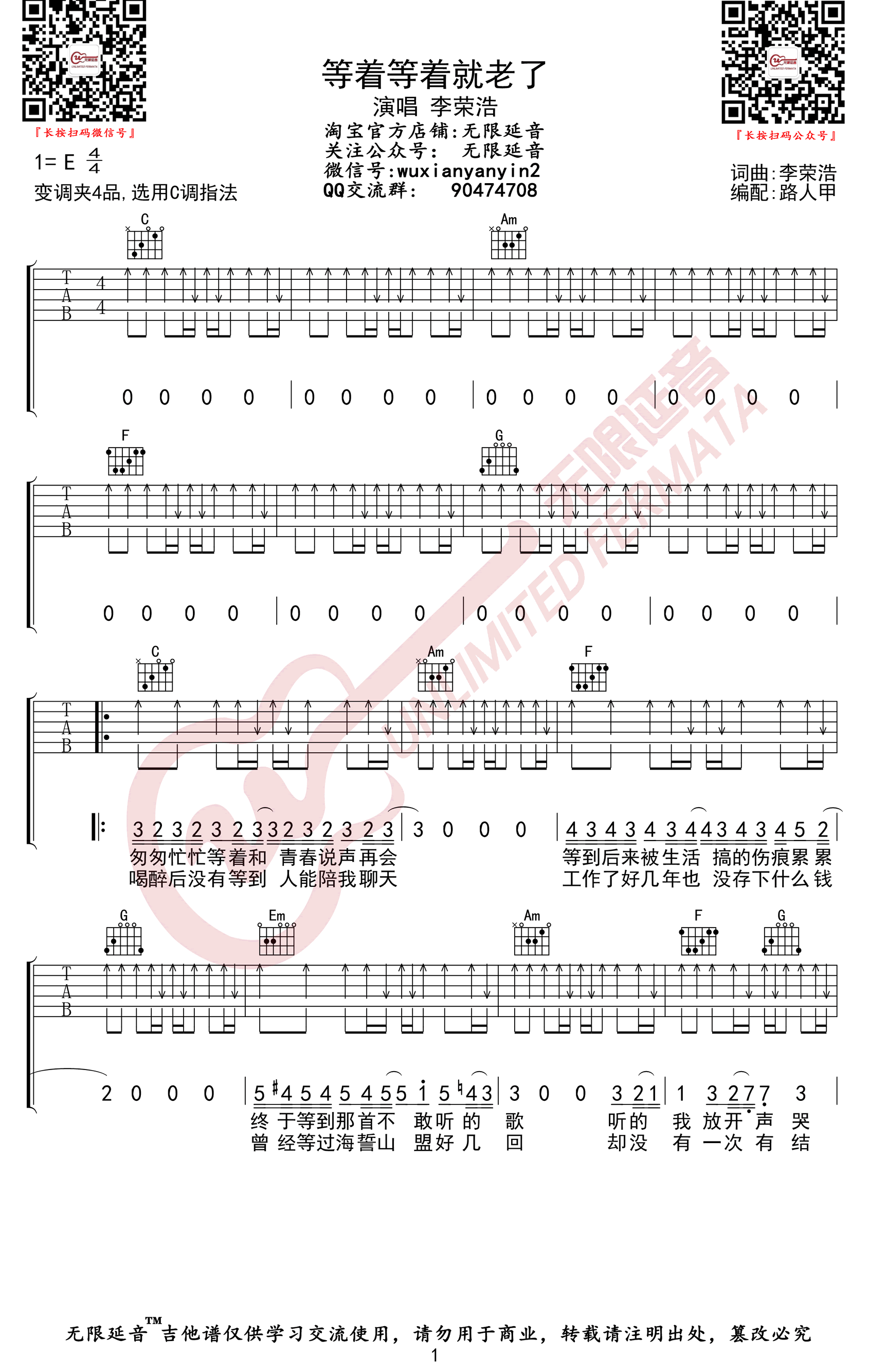 《等着等着就老了》吉他谱_李荣浩_C调弹唱六线谱_高清图片谱分享,《等着等着就老了》是由李荣浩作词、作曲并演唱的一首歌曲...
