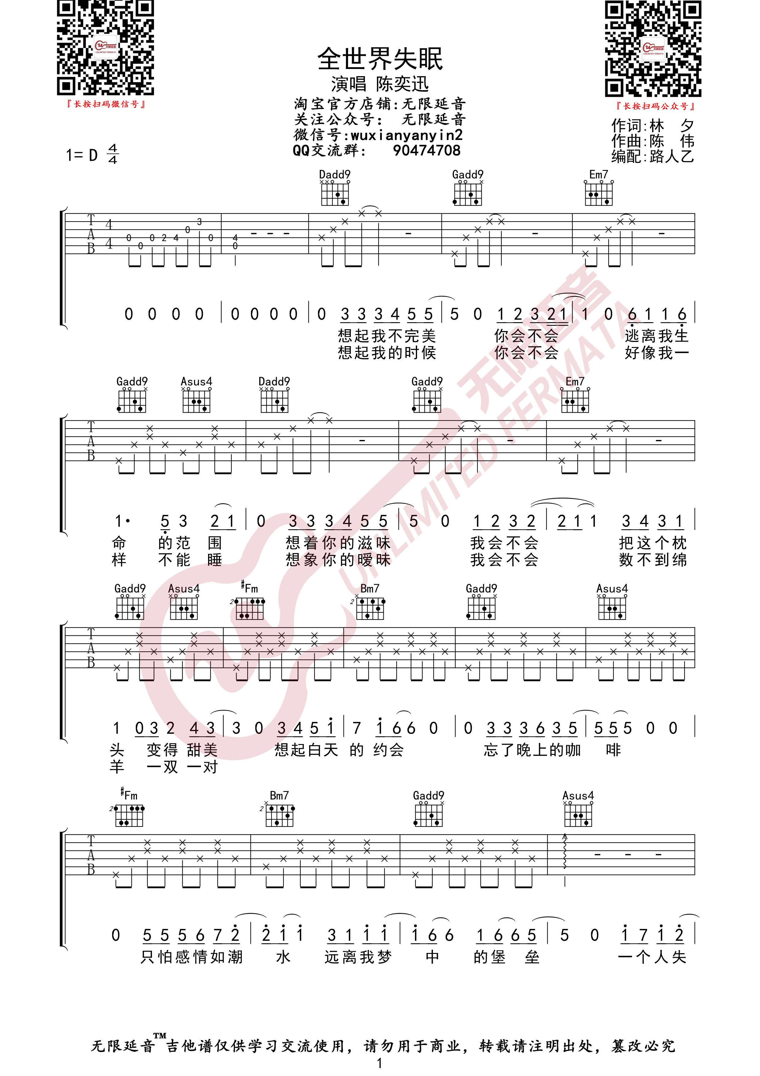 《全世界失眠》吉他谱_陈奕迅_D调简单版弹唱谱_高清六线谱分享,《全世界失眠》是由陈奕迅演唱的一首国语歌曲...