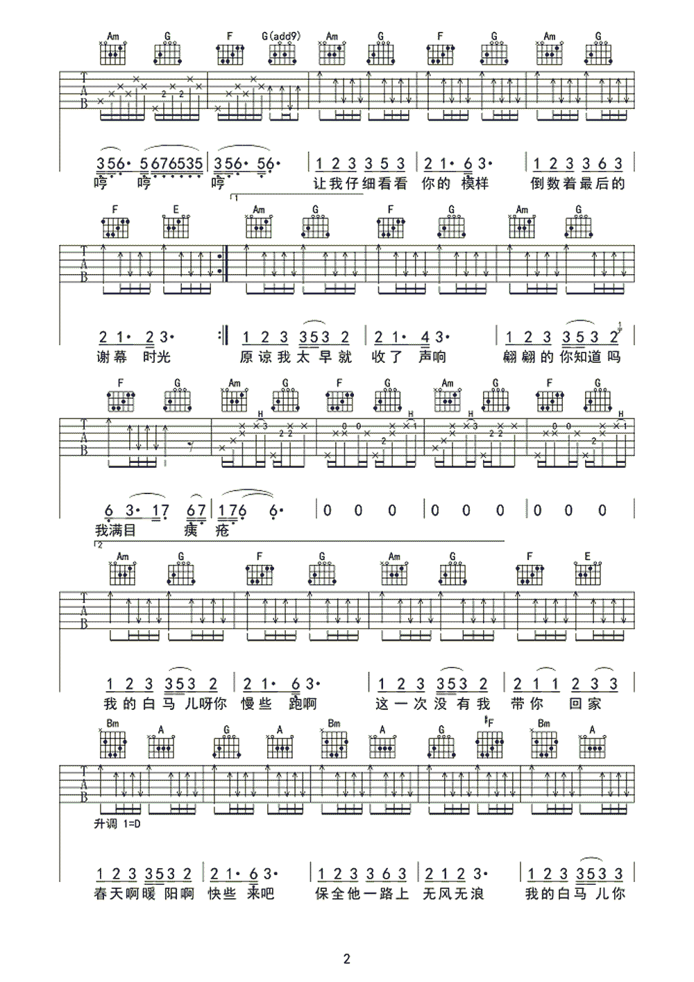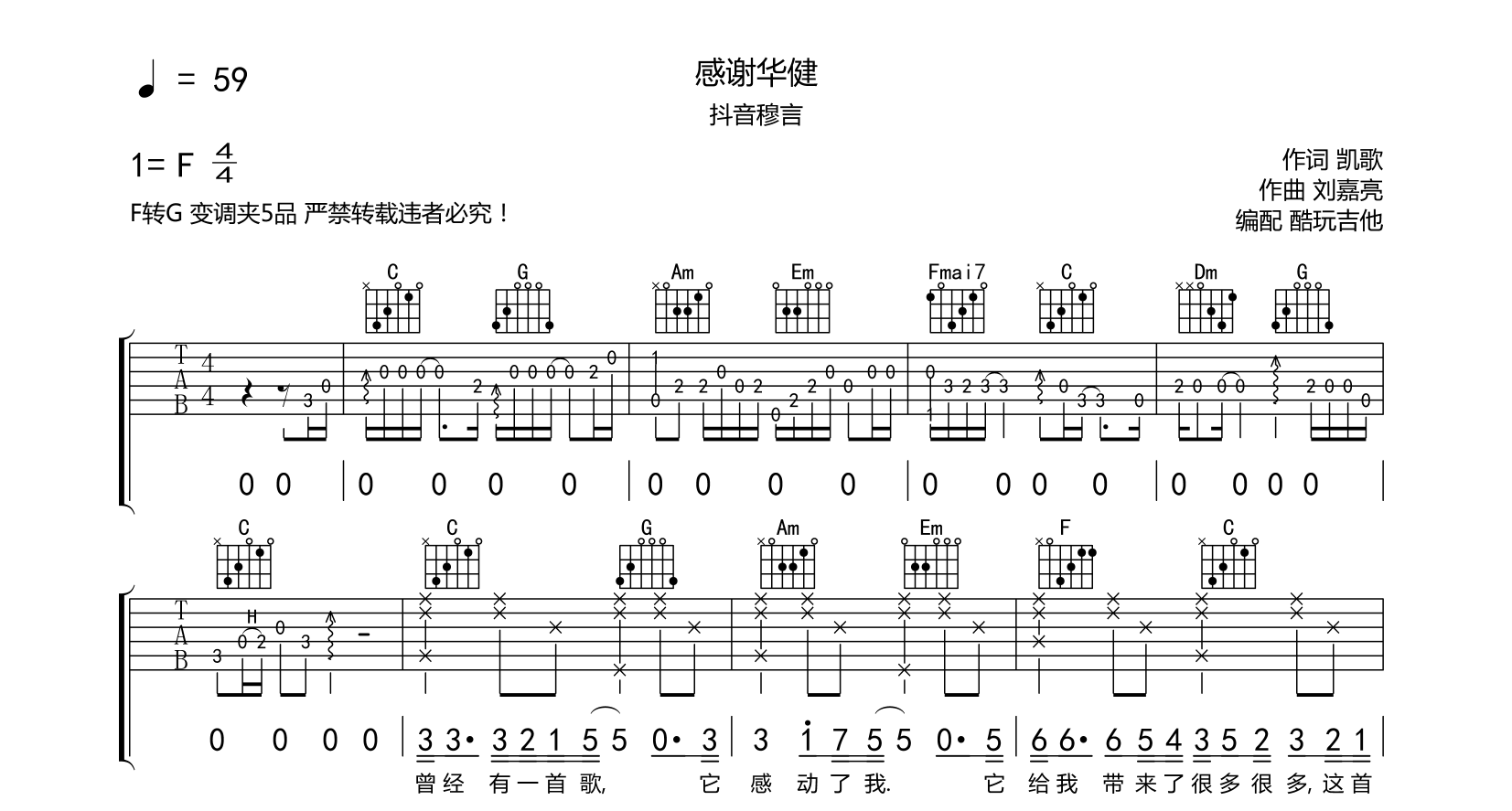 感谢华健吉他谱-抖音穆言-C调六线谱弹唱选C转D变调夹2品无大横按编配适合初学者音频为手机录制只是录制了第一遍以作试听示范...