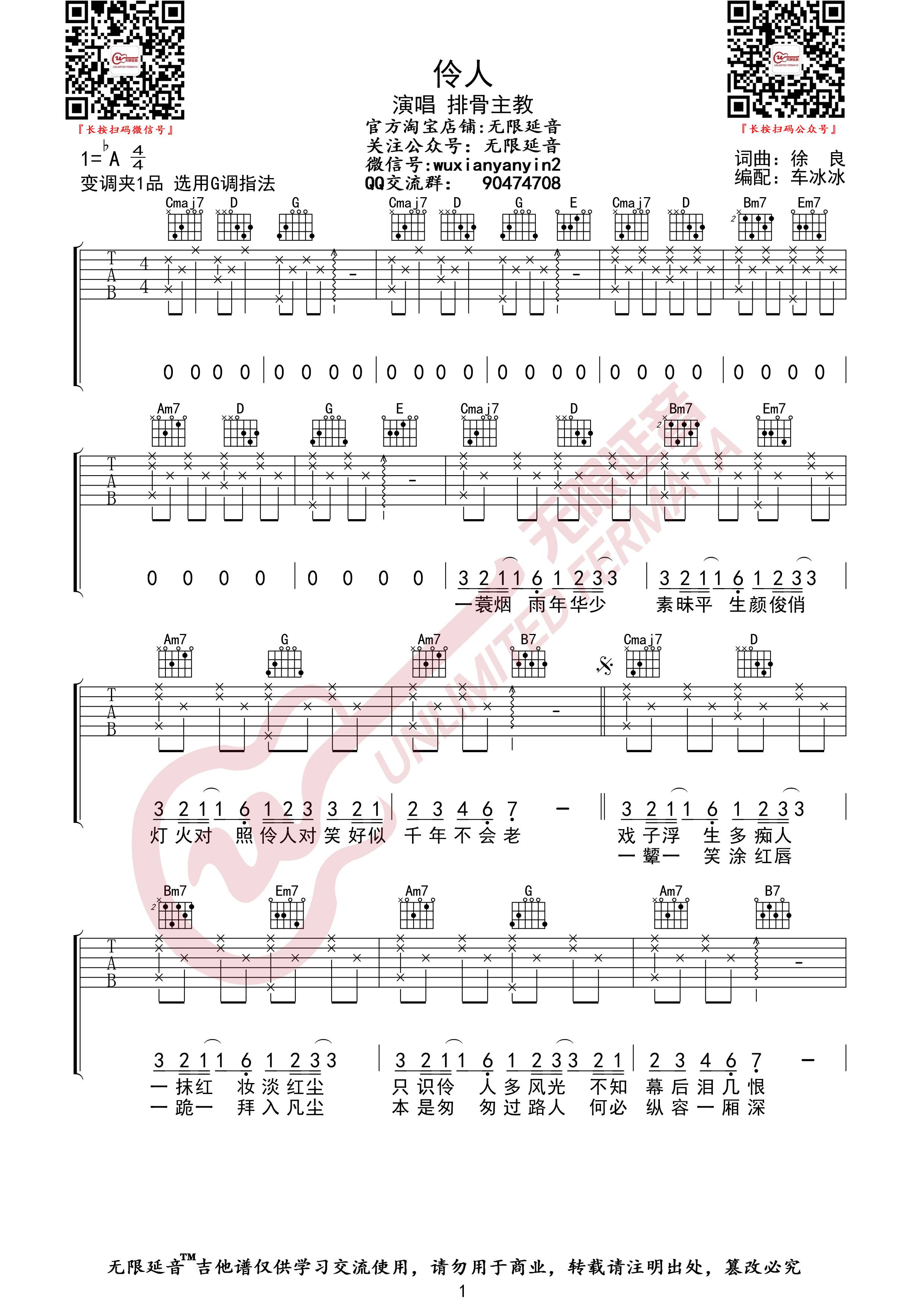 吉他排骨教主《伶人》吉他谱_古风歌曲_G调弹唱六线谱