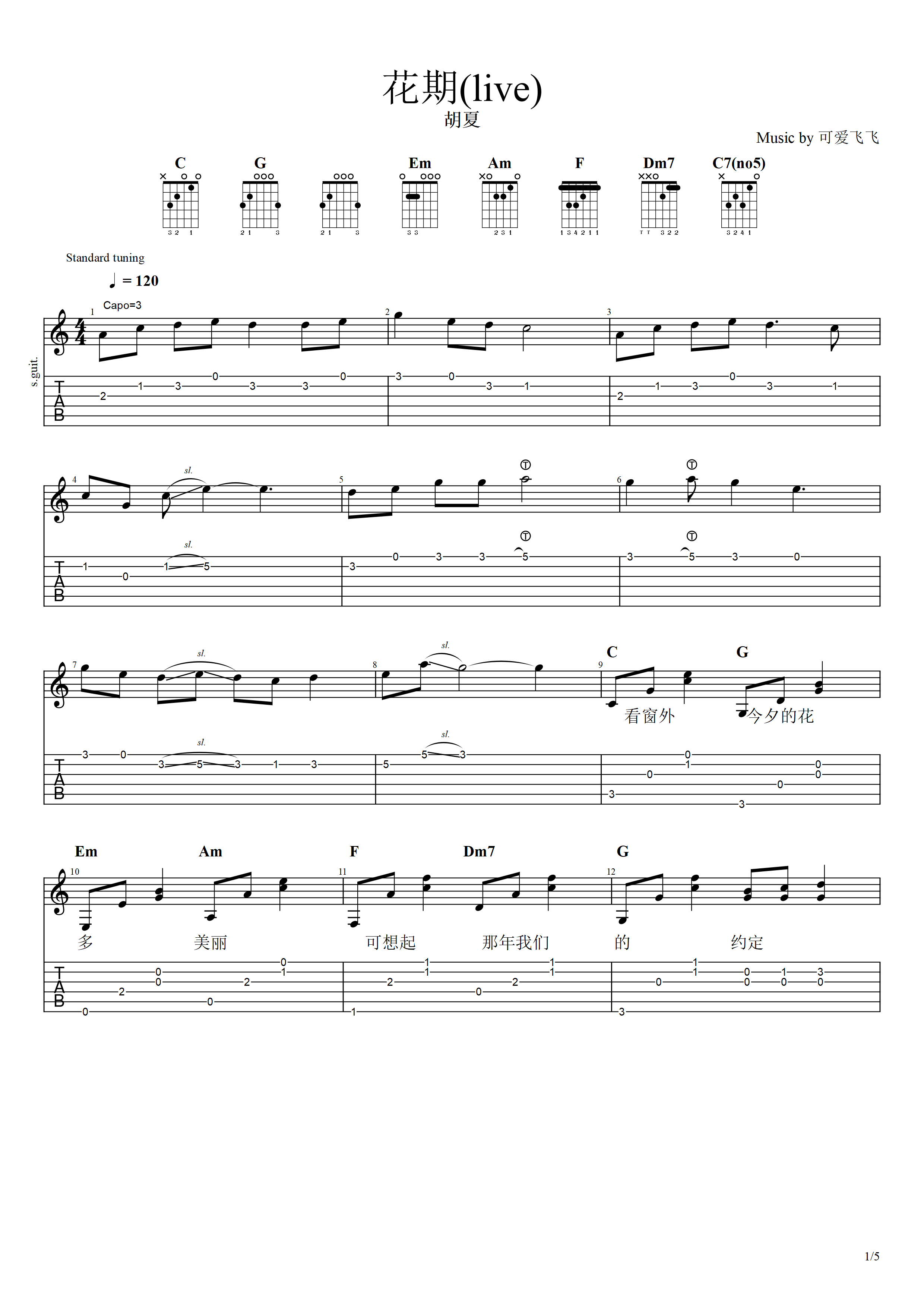 吉他花期吉他谱_胡夏_《花期》C调live版弹唱六线谱