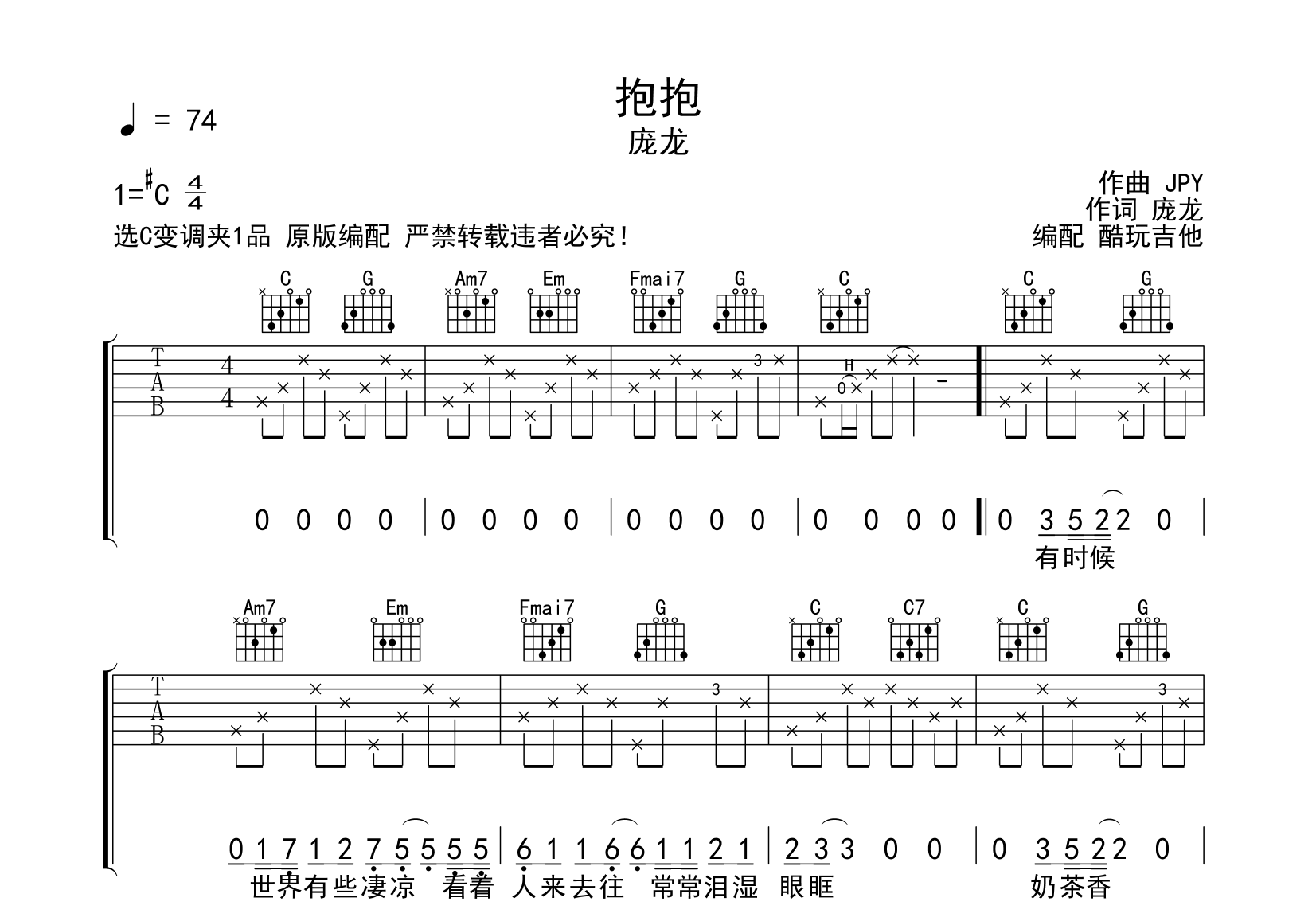 抱抱吉他谱-庞龙-六线谱弹唱首发-原版编配选C变调夹1品本人演奏示范没有夹变调夹自己演奏请夹到一品音频为手机示范完整录制以作示范试听歌曲编配原版效果且相对简单...