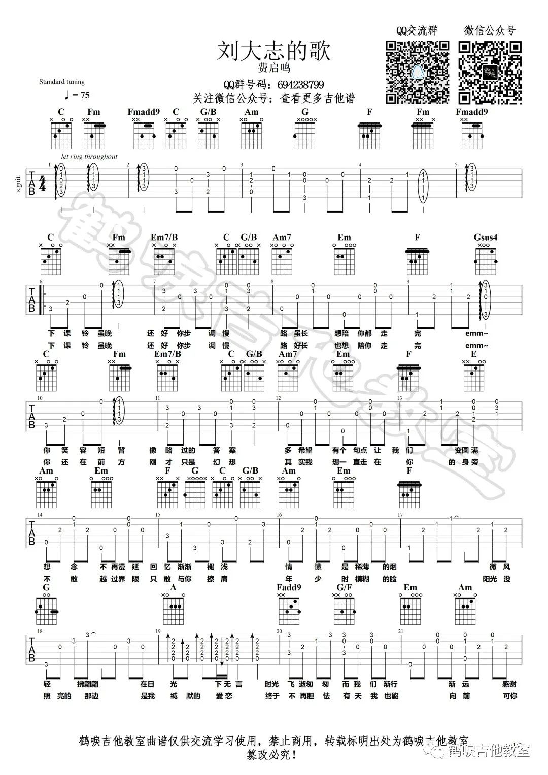 吉他费启鸣《刘大志的歌》吉他谱 C调弹唱谱