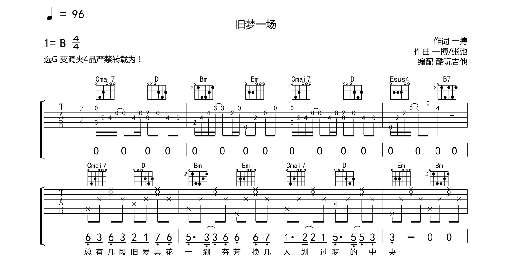 旧梦一场吉他谱-阿悠悠-六线谱弹唱首发选G变调夹4品音频为手机录制只是录制了第一遍到间奏以作试听示范...