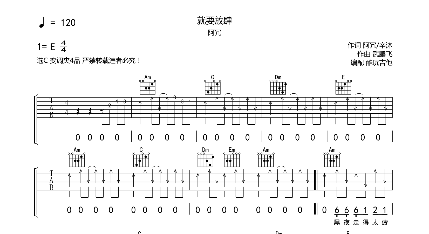 就要放肆吉他谱-阿冗-六线谱弹唱首发选C变调夹4品音频为手机录制只是录制了第一遍以作音频试听示范编配弹奏比较简单...