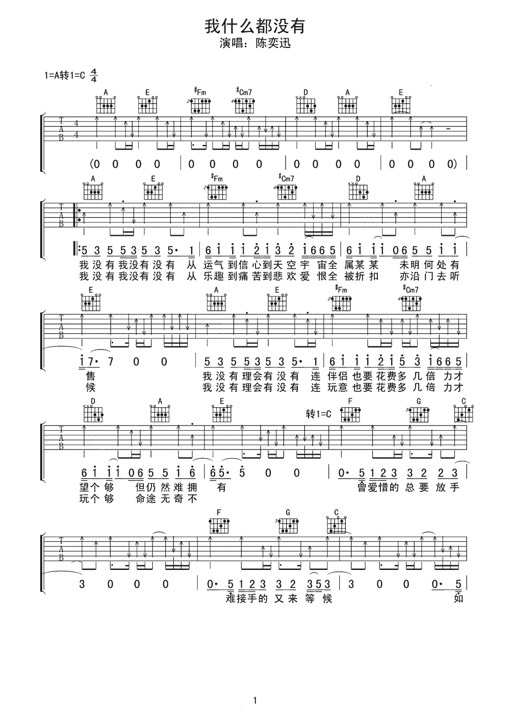 陈奕迅我什么都没有吉他谱,A转C调指法,我什么都没有六线谱3张。...