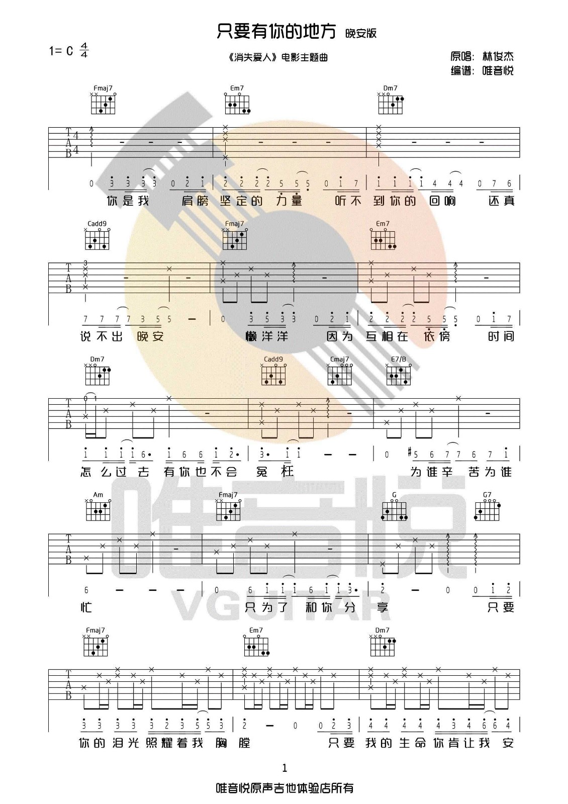 《只要有你的地方》吉他谱_林俊杰_C调弹唱六线谱_高清图片谱分享,《只要有你的地方》是林俊杰作曲并演唱的一首歌曲,是电影《消失的爱人》的主题曲。...