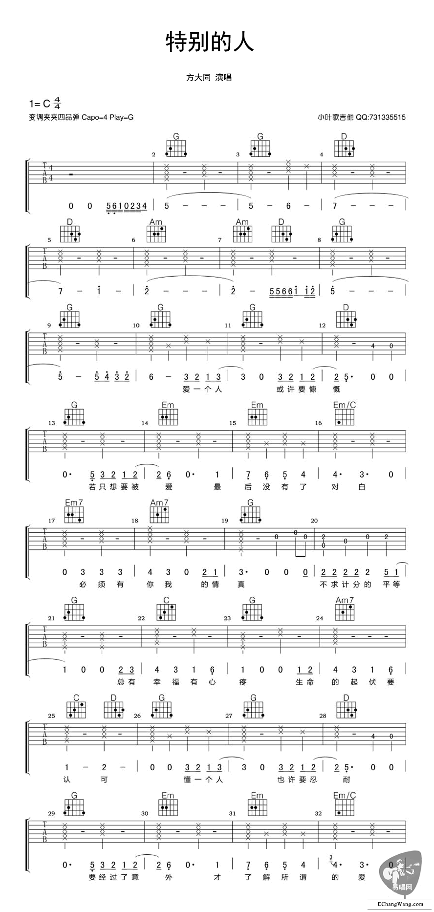 《特别的人》吉他谱_方大同_G调原版弹唱六线谱_高清图片谱分享,《特别的人》是由方大同填词、谱曲并演唱的一首慢板抒情歌。...