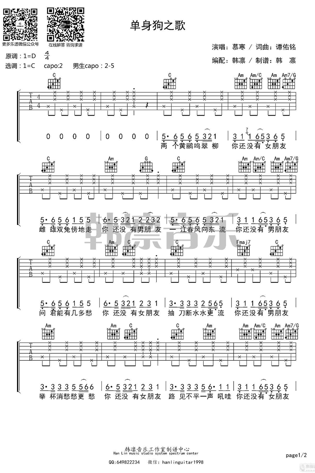 《单身狗之歌》吉他谱_慕寒_C调六线谱_吉他弹唱教学分享,《单身狗之歌》是由慕寒演唱的一首歌...