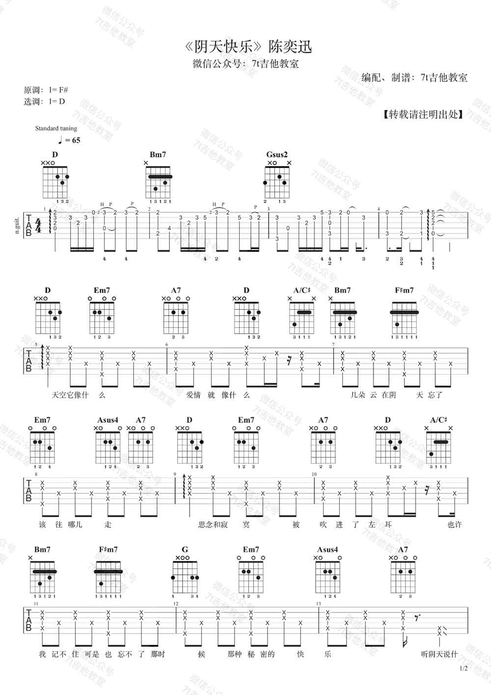 阴天快乐吉他谱,用了D调编配,阴天快乐六线谱有2页。...