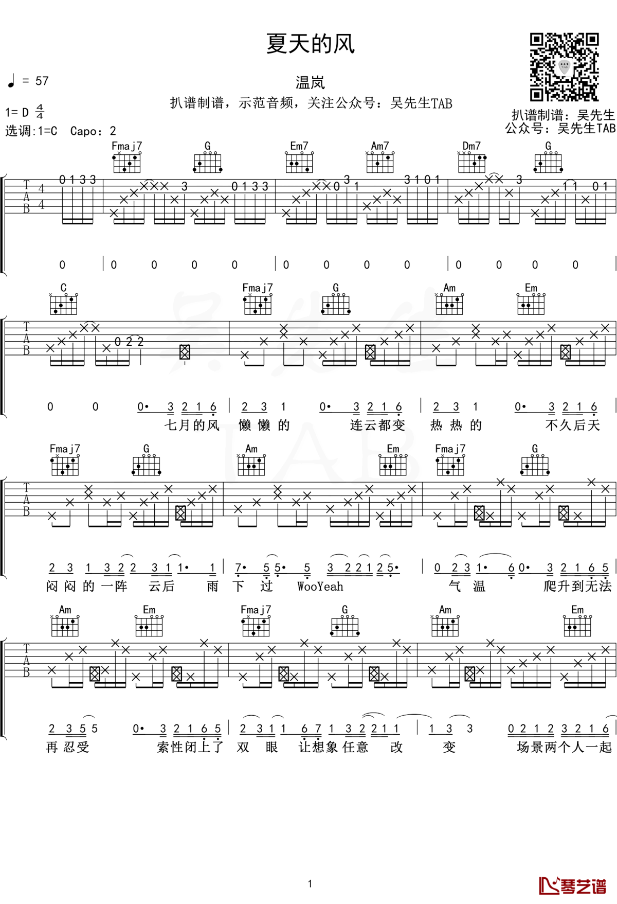 吉他夏天的风吉他谱 G调男声版 温岚 高清弹唱谱
