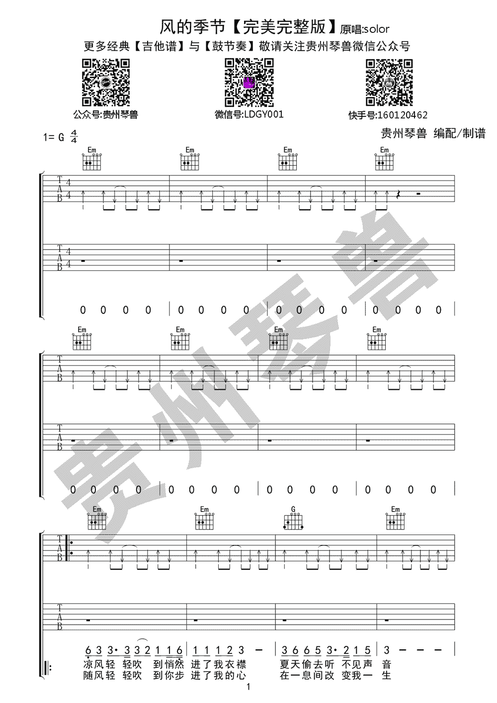 Soler风的季节吉他谱,G调双吉他伴奏六线谱编配,六页谱子。...