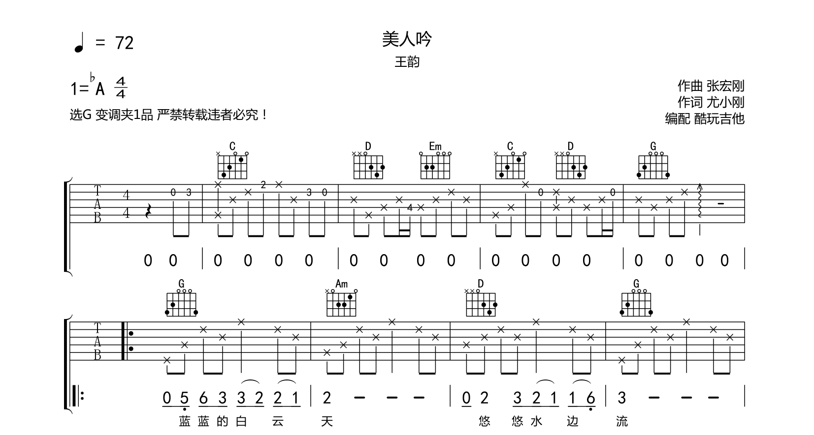 美人吟吉他谱王韵版-六线谱弹唱选G变调夹1品编配比较简单相对还原适合初学者音频为手机录制只是录制了第一遍以作示范演奏...