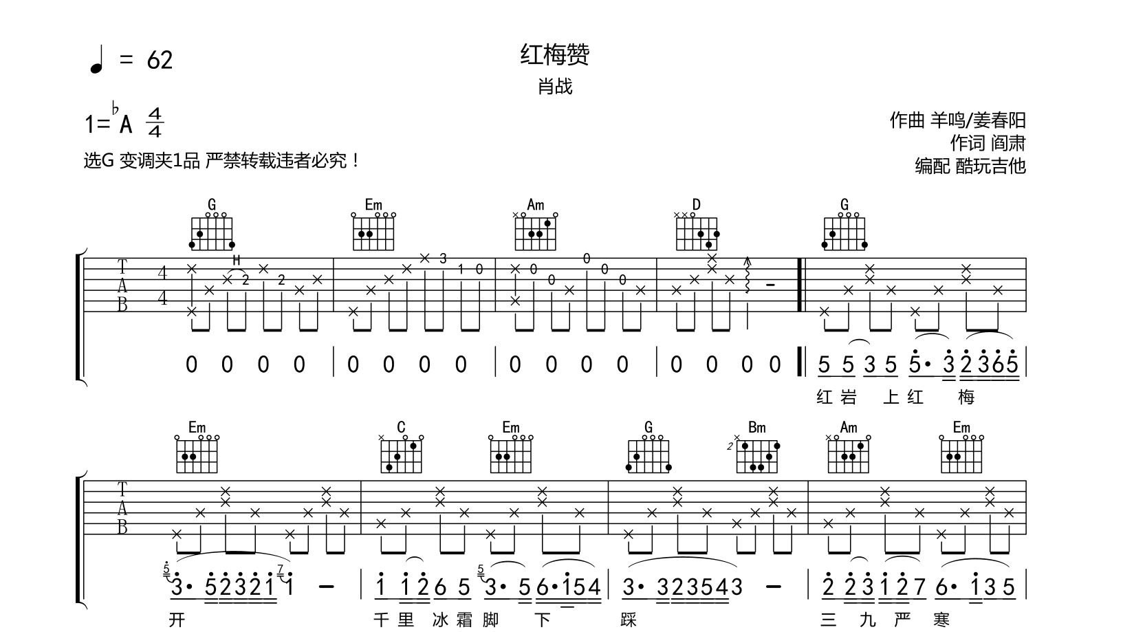 红梅赞吉他谱肖战-六线谱弹唱选G变调夹1品附前奏间奏音频为手机录制完整录制以作试听示范...