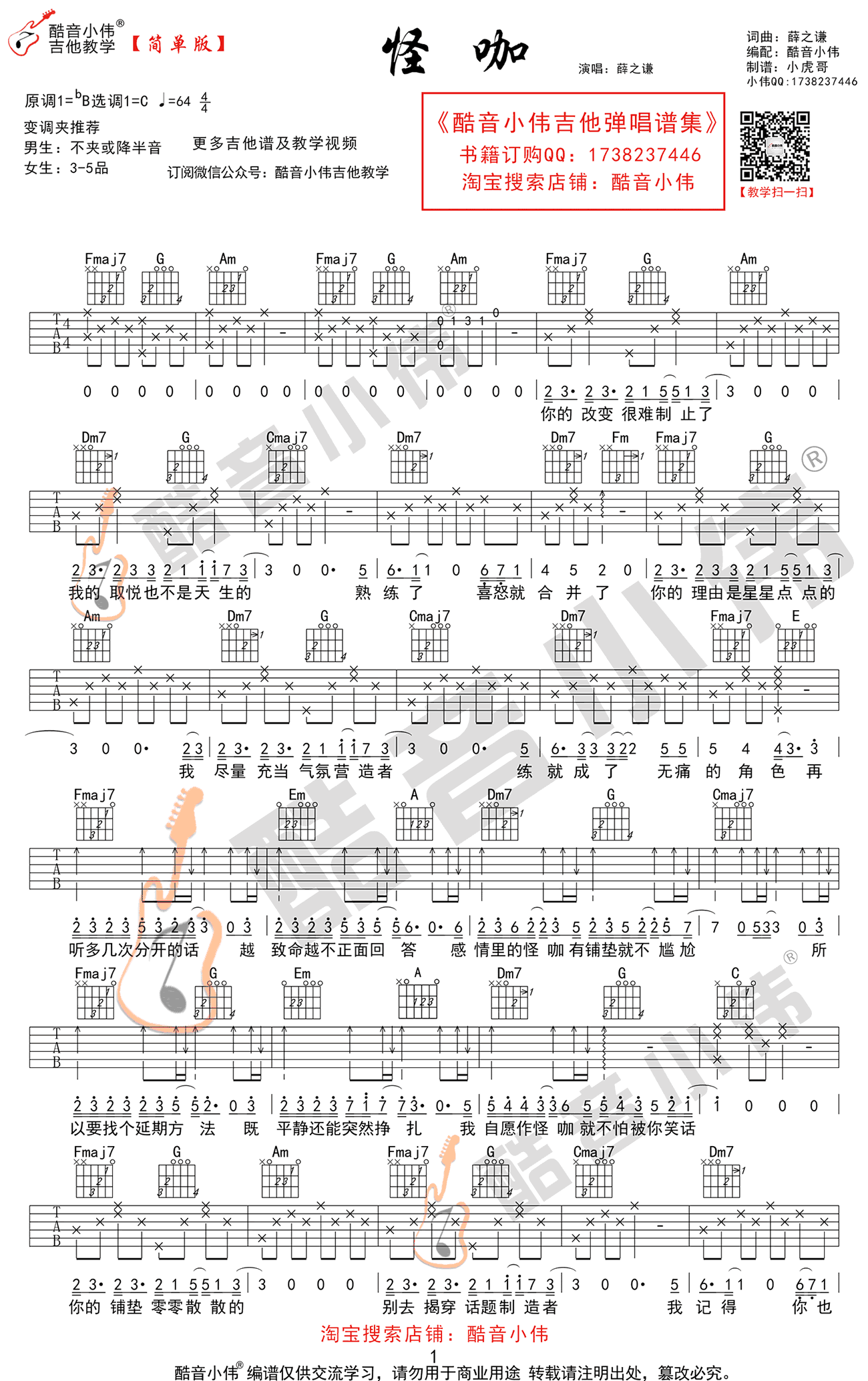 怪咖吉他谱_薛之谦_《怪咖》C调简单版弹唱谱_高清六线谱分享,《怪咖》是由薛之谦创作并演唱的一首歌。...