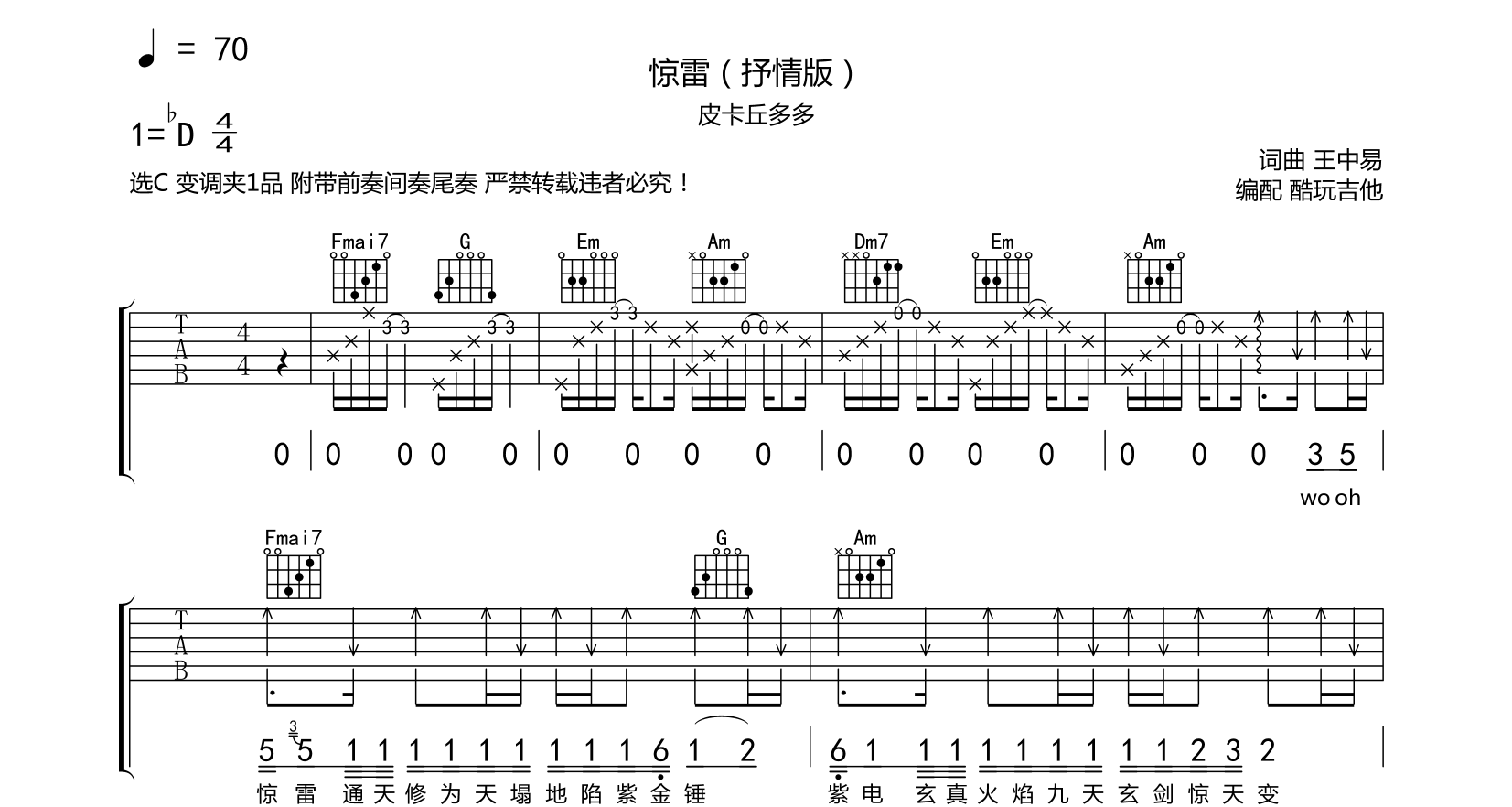 惊雷(抒情版)皮卡丘多多-六线谱弹唱首发选C变调夹1品附带完整前奏间奏尾奏音频为手机录制只是录制了第一遍以作试听示范...