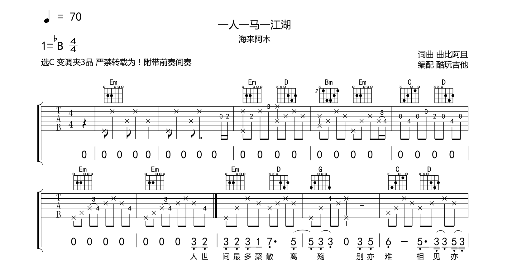 一人一马一江湖吉他谱-海来阿木六线谱弹唱首发附带前奏间奏选G变调夹3品音频为手机录制完整录制谱面没有重复以作试听示范自己演奏请按照重复段落弹唱...