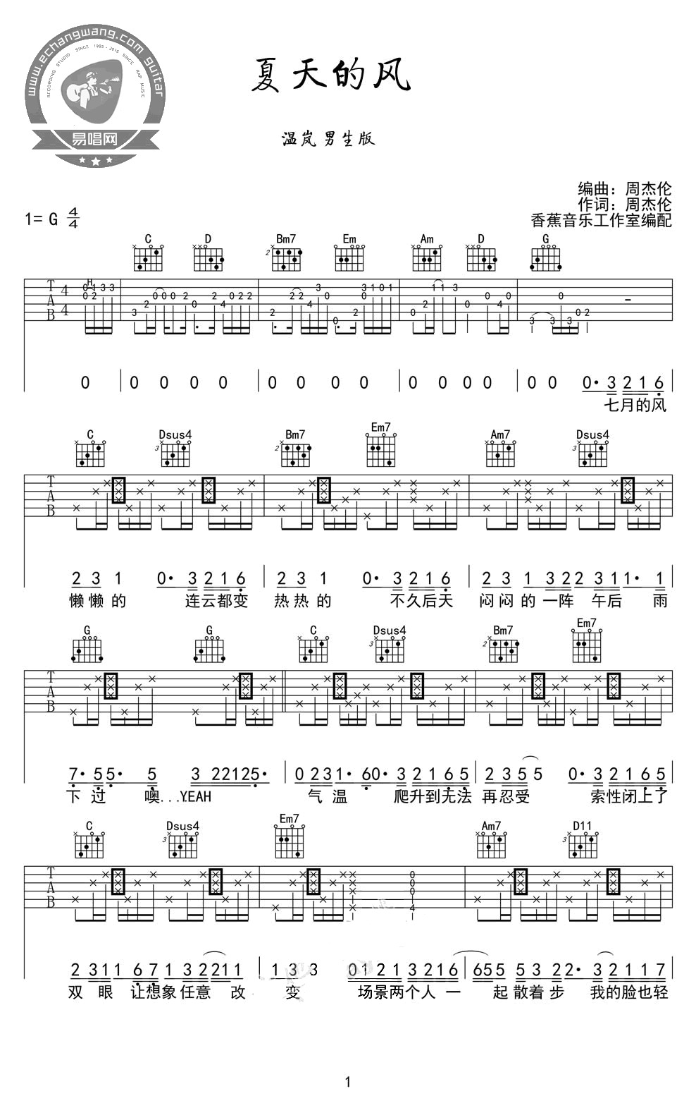 夏天的风吉他谱,周杰伦词曲创作,温岚演唱的一首经典代表歌曲,夏天的风吉他弹唱谱,男生版G调指法,高清图片谱。...