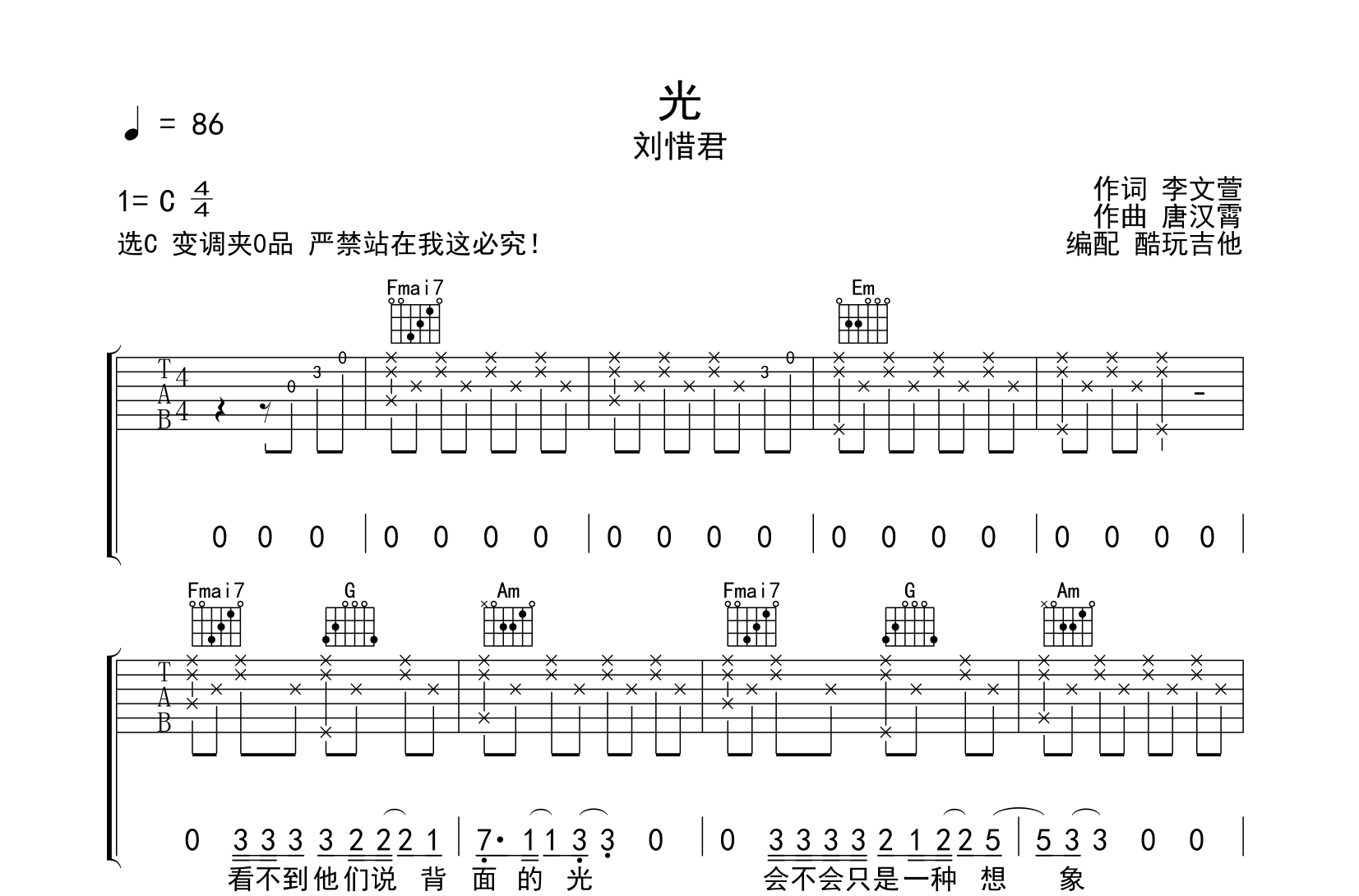 光吉他谱-刘惜君弹唱谱首发选C变调夹0品音频为手机录制完整录制了谱面没有重复以作试听示范自己演奏请按曲谱重复段落演奏歌曲比较简单...