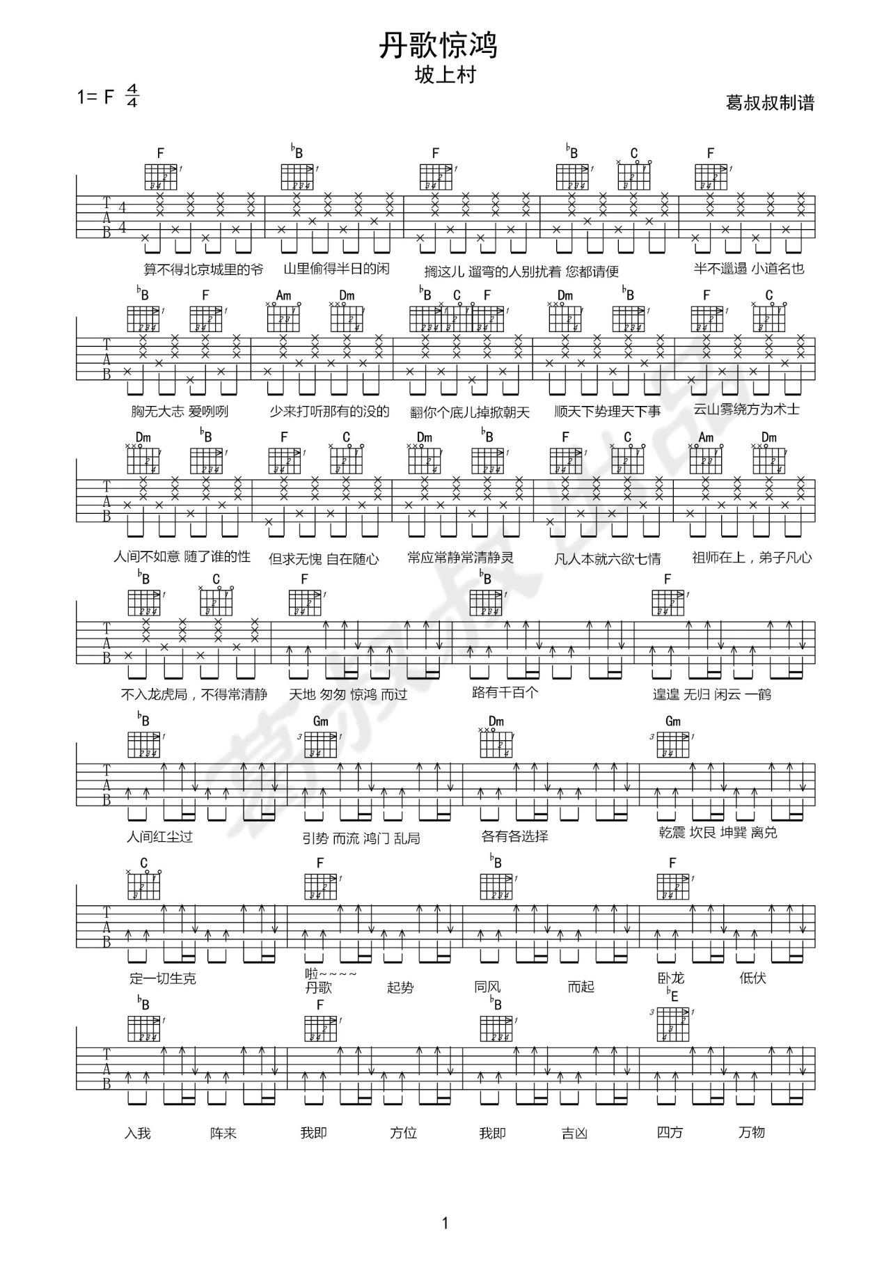 吉他坡上村《丹歌惊鸿》吉他谱 F调弹唱谱