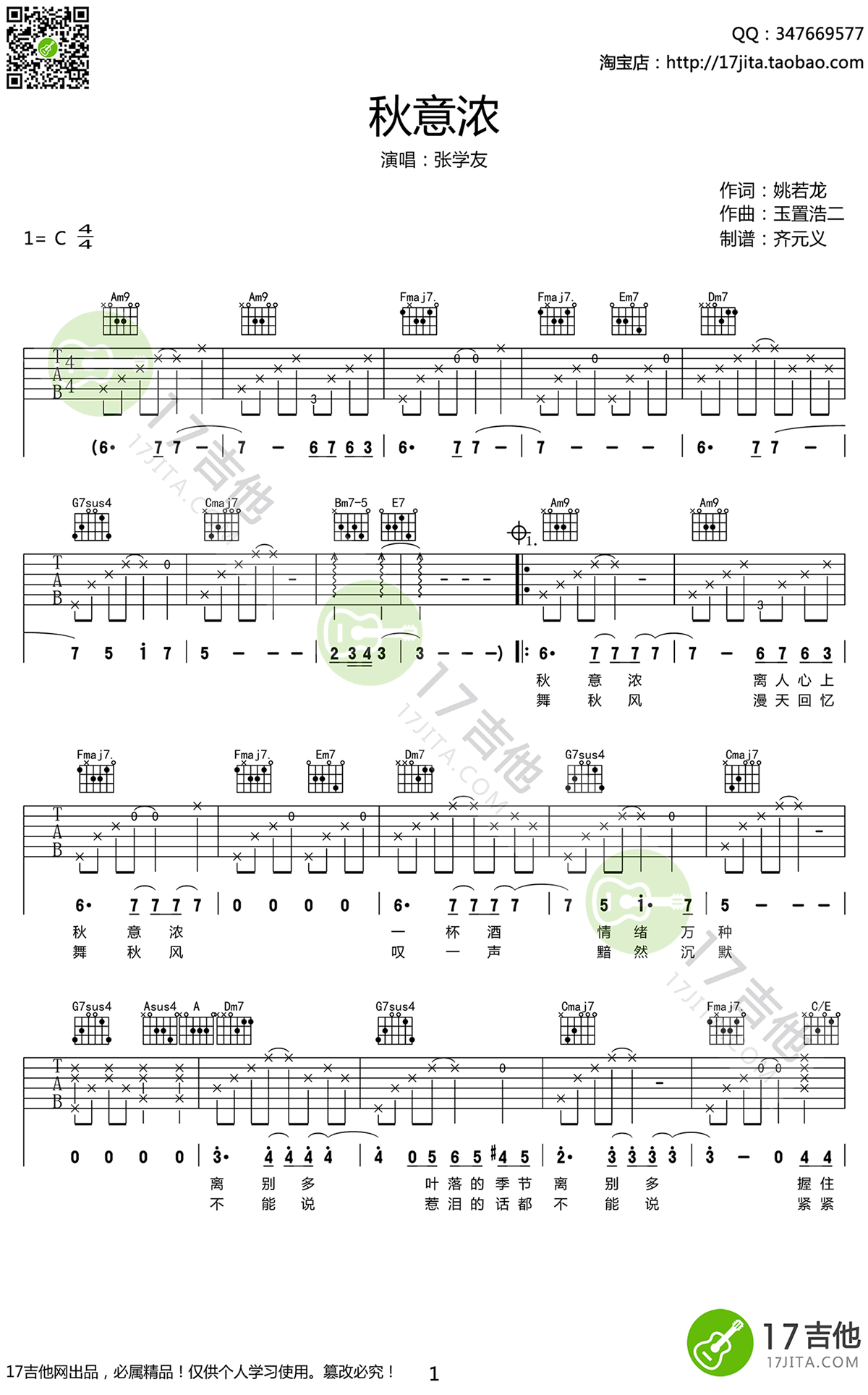 秋意浓吉他谱_张学友_《秋意浓》C调弹唱谱_高清六线谱分享,《秋意浓》是张学友演唱的一首歌曲。...