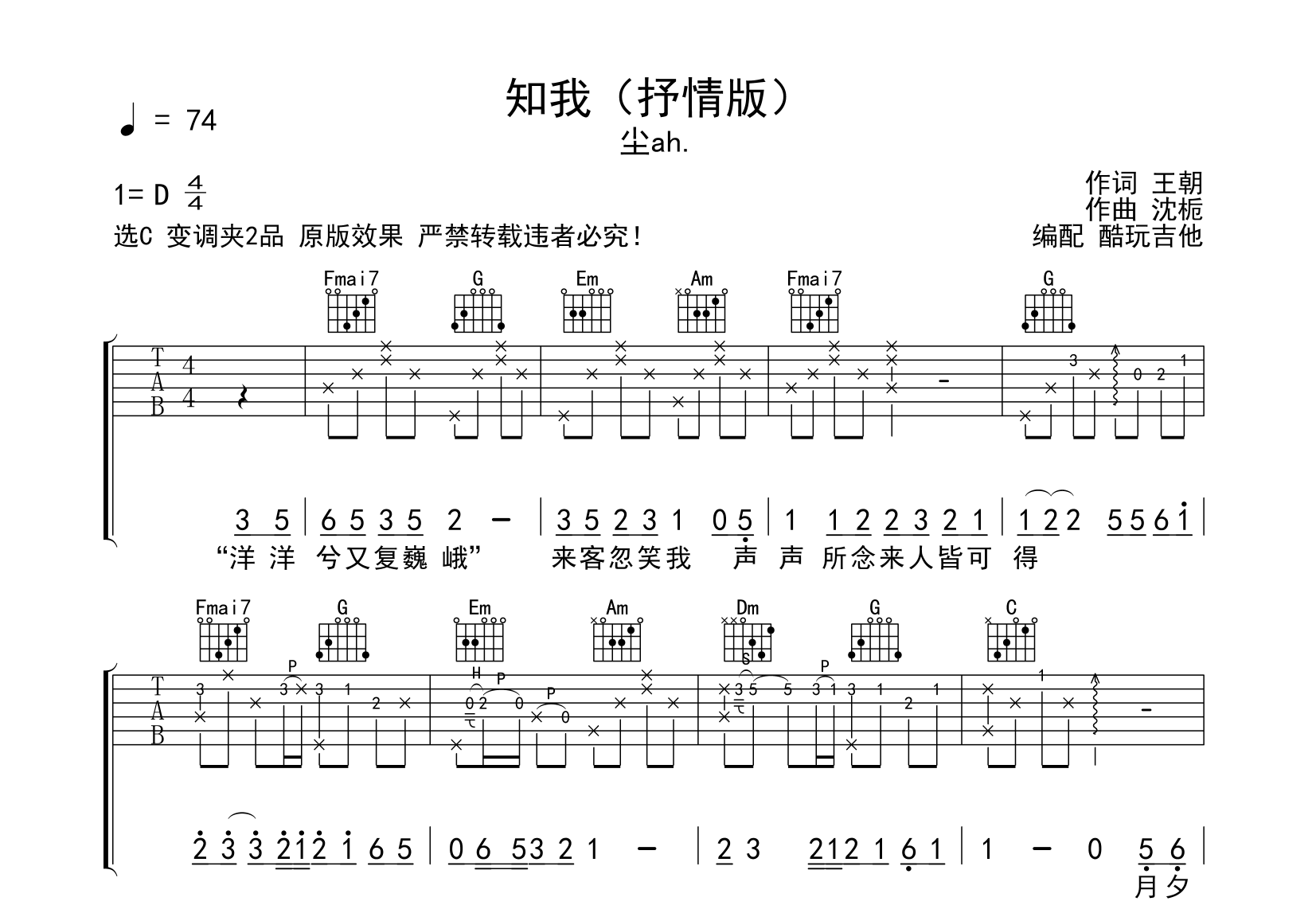 知我(抒情版)吉他谱-尘ah.-弹唱谱首发-原版效果选C变调夹2品共4页附带完整前奏间奏间奏有点长吉他谱原版为两把吉他这里合为一把编配方便演奏SOLO改编为独奏形式演奏谱中Harm人工泛音请参考网络教学演奏可忽略此技巧直接弹奏...