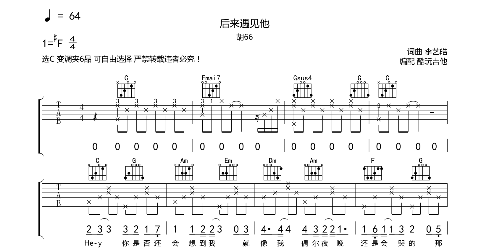 后来遇见他吉他谱-胡66-弹唱谱首发选C变调夹6品可自主选择附前奏间奏尾奏音频为手机录制按照谱面完整录制没有重复段以作试听示范自己弹奏请按重复段落演奏...