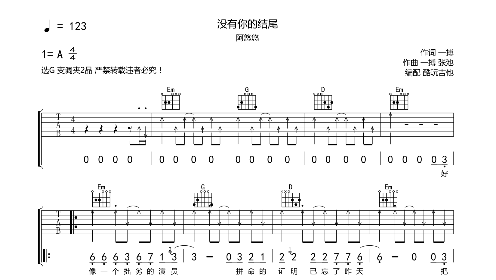 没有你的结尾吉他谱-阿悠悠-弹唱谱首发选G变调夹2品第一小节用的左手制音(虚按)不会可忽略弹唱节奏扫弦用到切音音频为手机录制只是录制第一遍以作示范演奏...