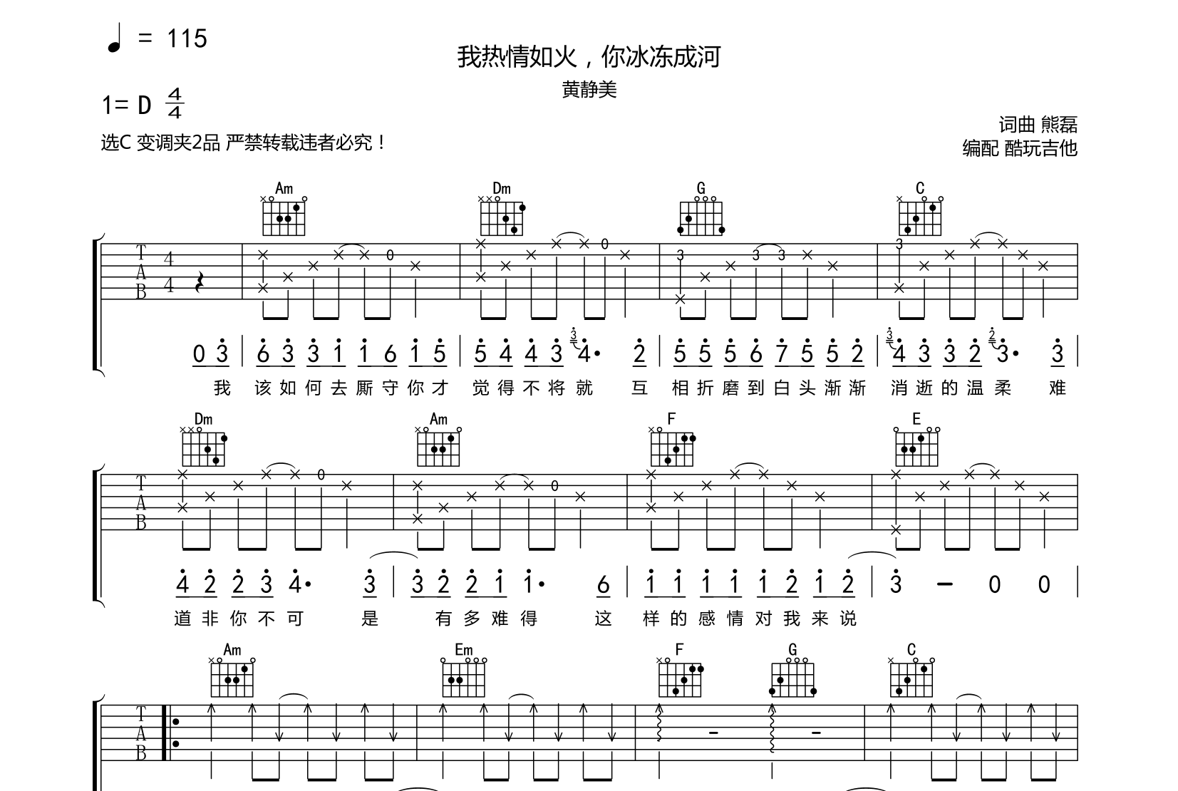 我热情如火,你冰冻成河吉他谱-黄静美-弹唱谱选C变调夹2品开头为了还原色彩我采用了分解自己可选择扫弦演奏音频为手机录制只是录制了第一遍到间奏结束以作示范试听...