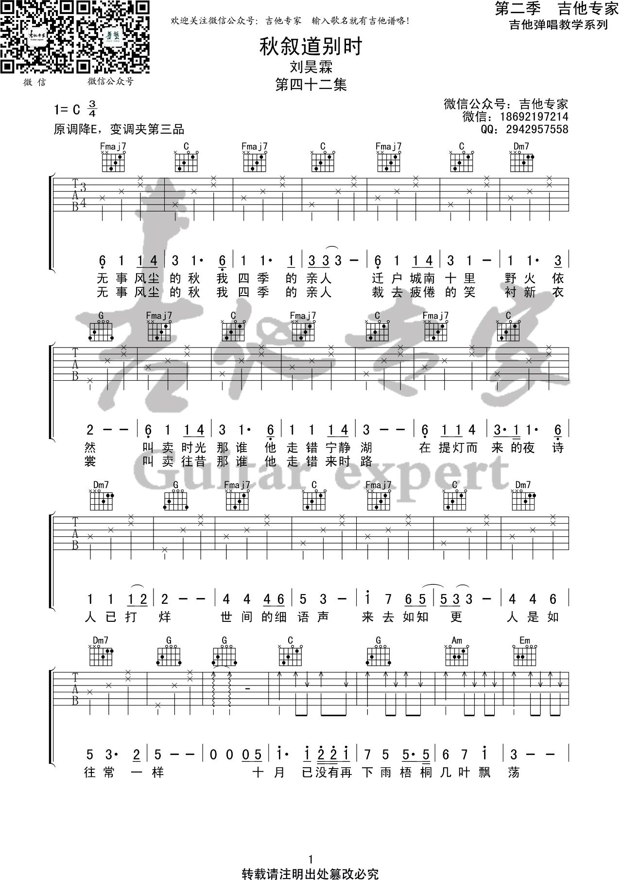 吉他刘昊霖《秋叙道别时》吉他谱 C调弹唱谱