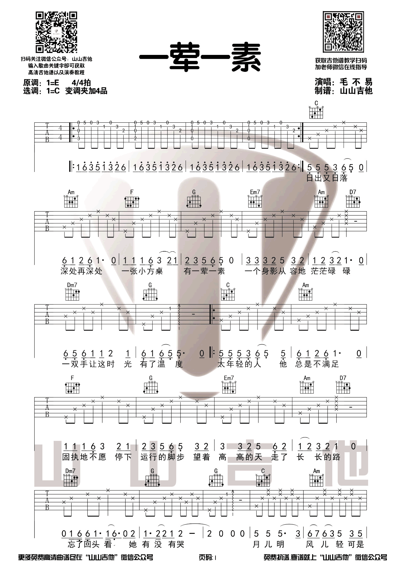 原调E选调C,变调夹夹第四品。一荤一素六线谱,两张弹唱图片谱,山山吉他出品...