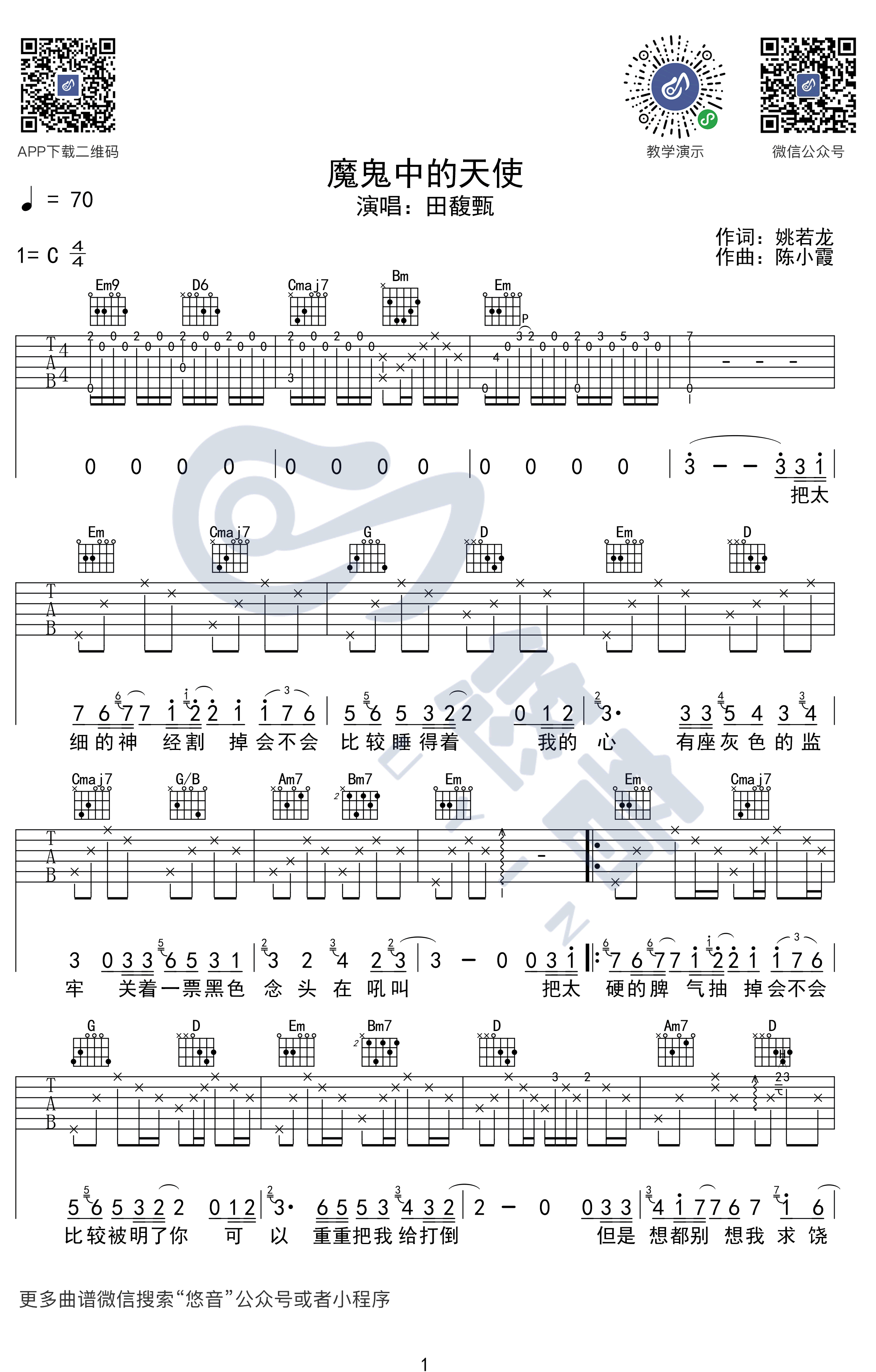 吉他魔鬼中的天使吉他谱_田馥甄