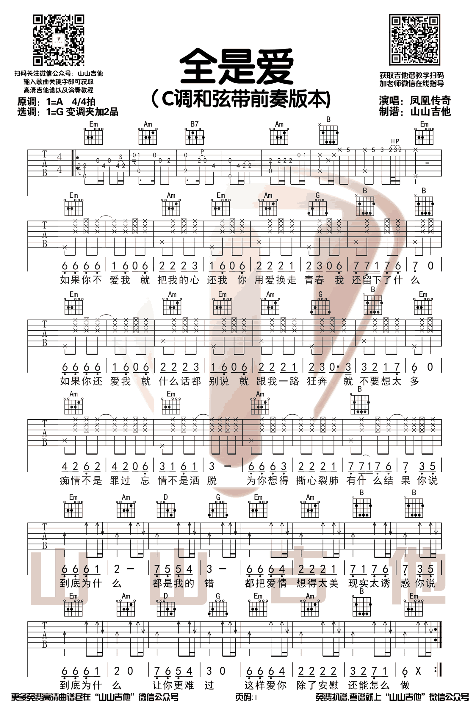 吉他全是爱吉他谱_凤凰传奇_带前奏原版