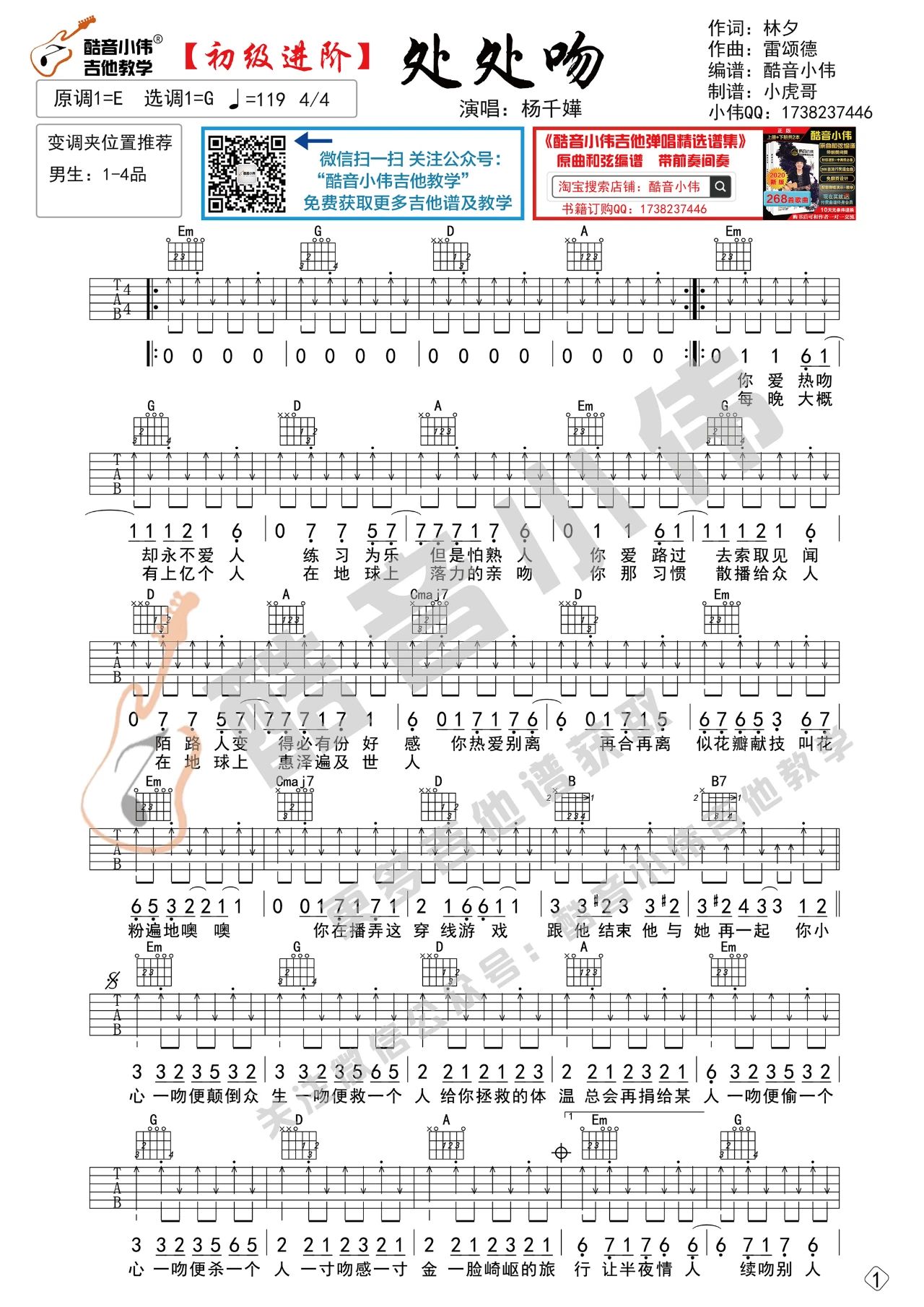 吉他杨千嬅《处处吻》吉他谱 G调酷音小伟编配