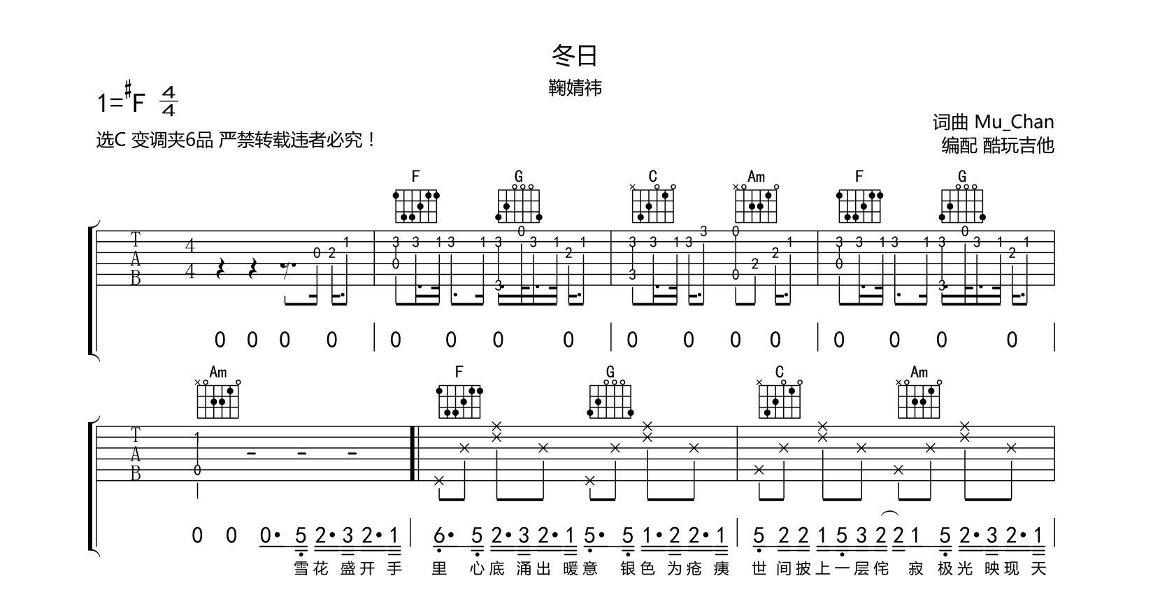 冬日吉他谱-鞠婧祎-弹唱谱-琴友定制变调夹6品选C音频只是示范了前奏以作试听示范...
