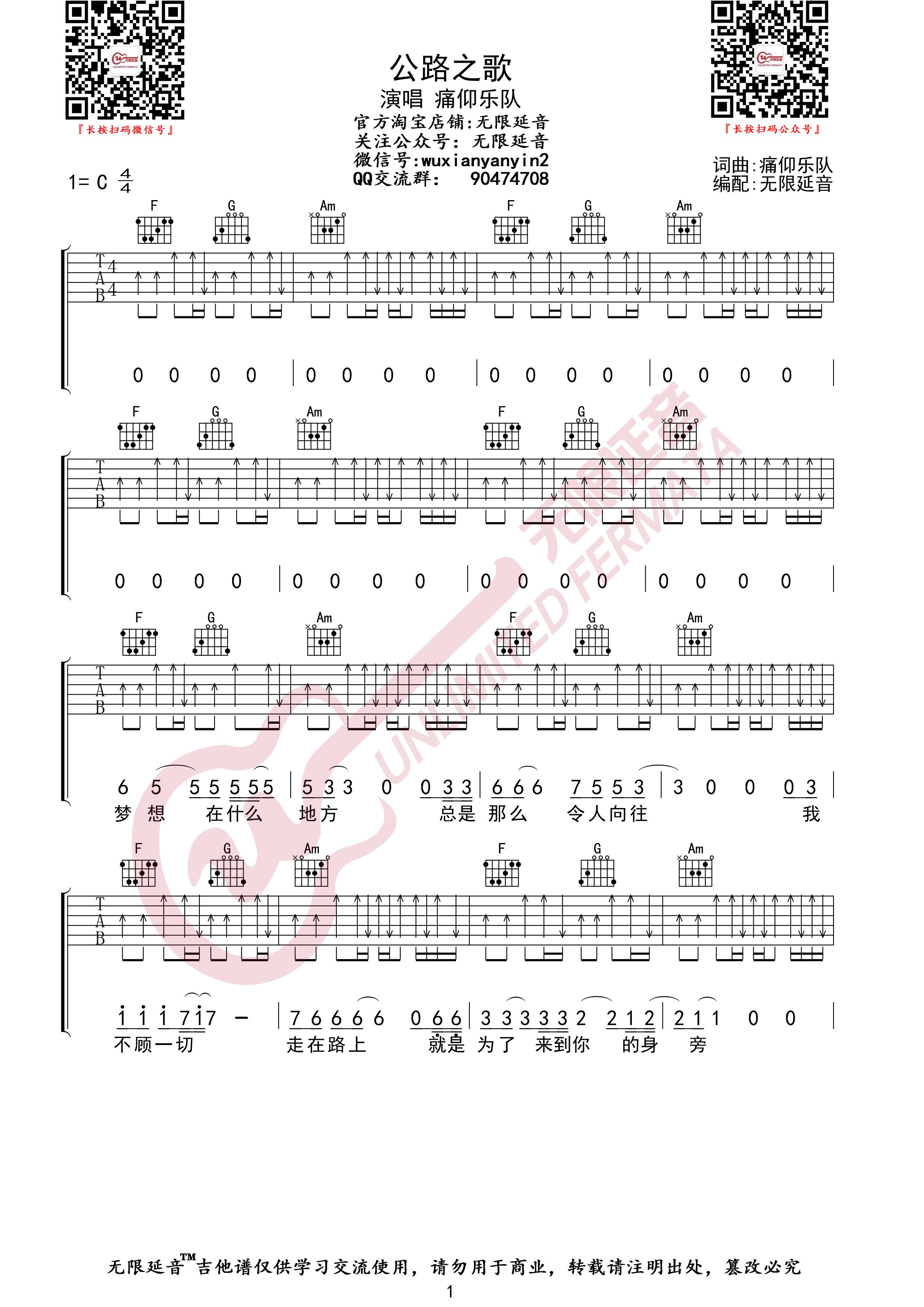 来自无限延音编配《公路之歌》吉他谱,C调版六线谱...