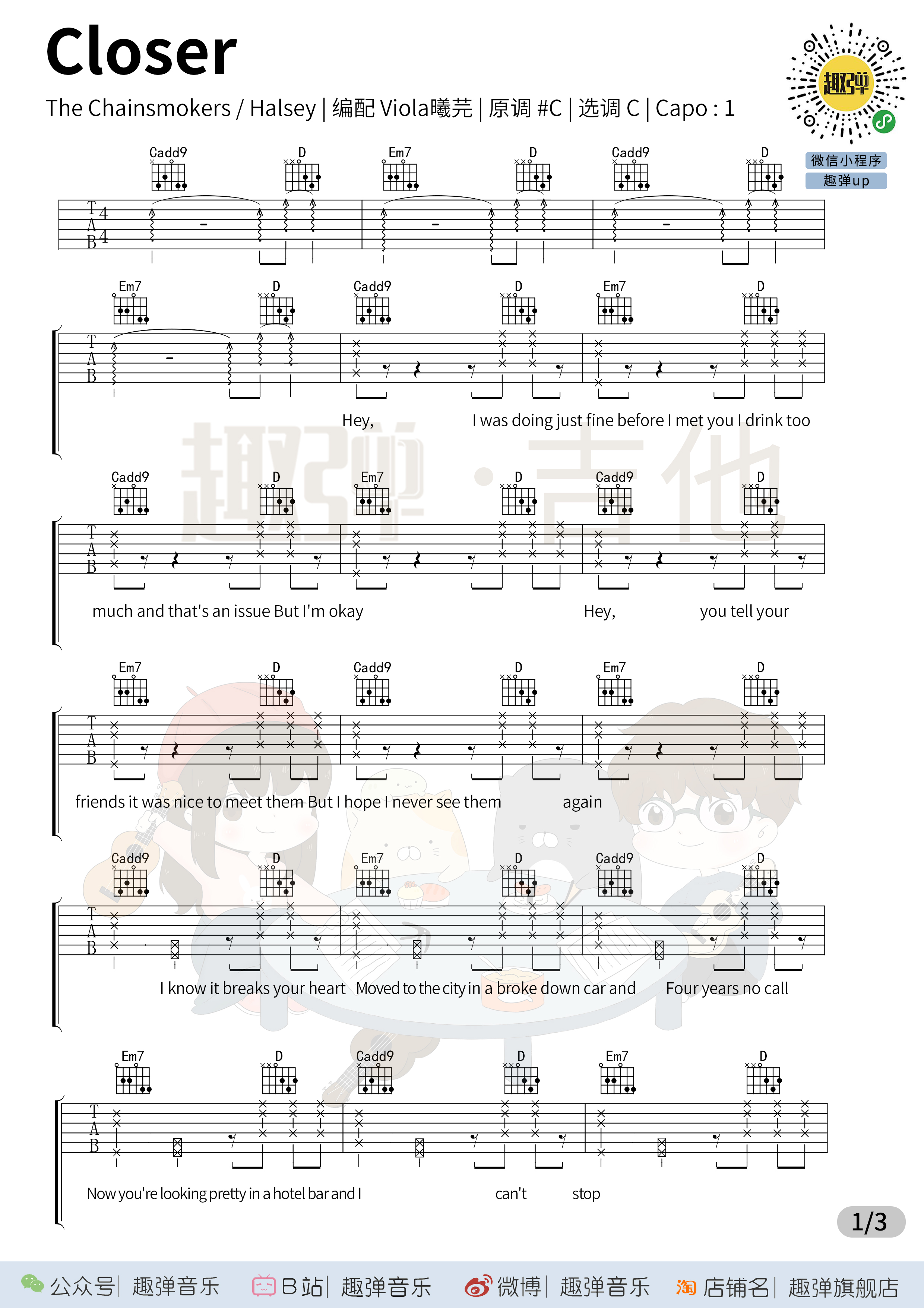 选调:C调Caps:不夹TheChainsmokers烟鬼《Closer》_高清吉他谱_趣弹吉他编配...