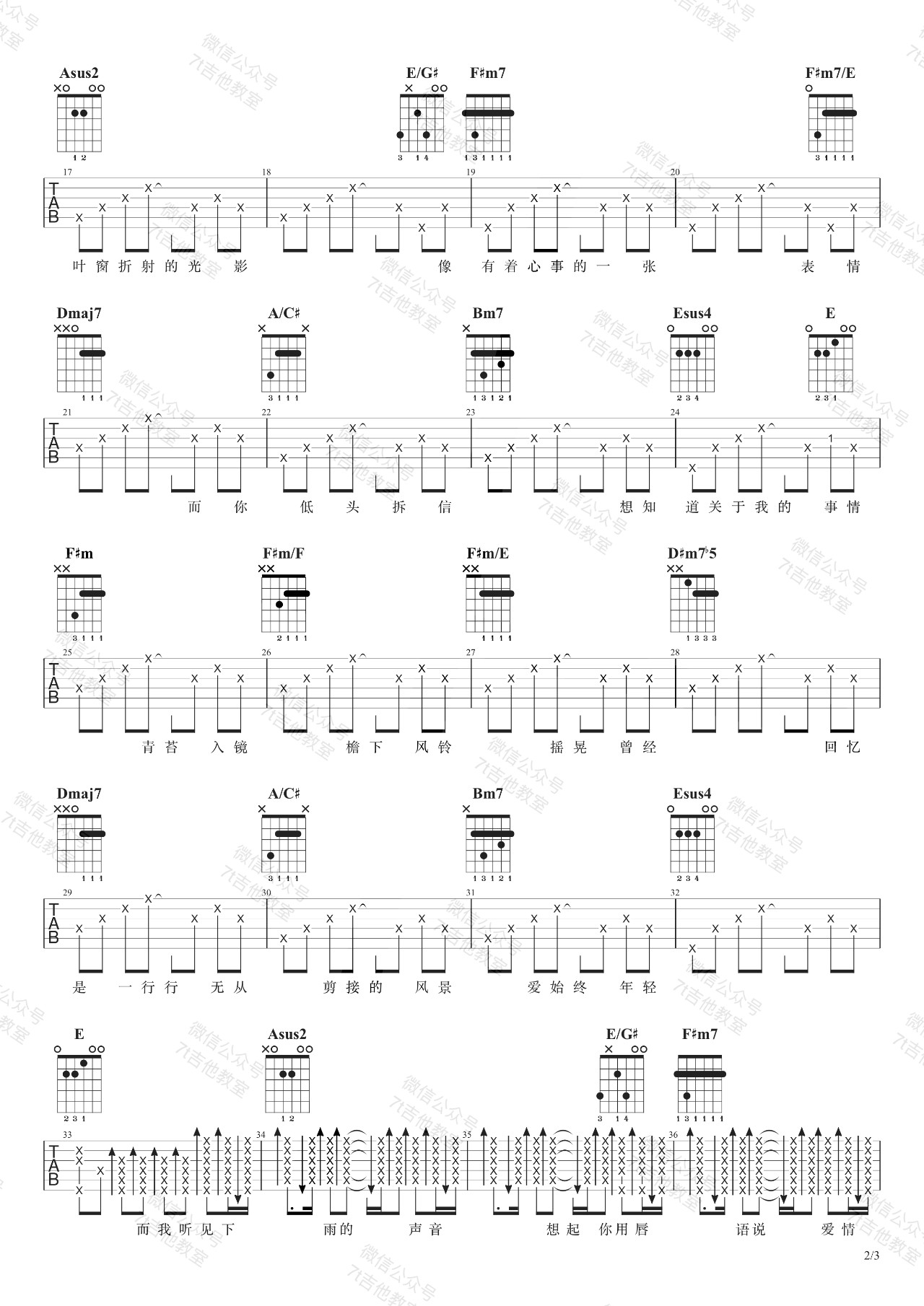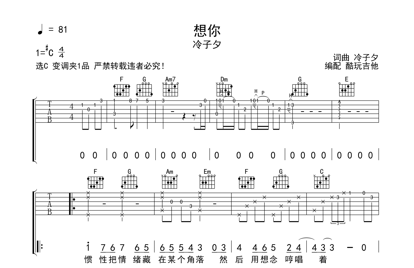 C调完美版,变调夹夹五品。需要人陪六线谱,三张高清弹唱谱,乐星人吉他教室出品...
