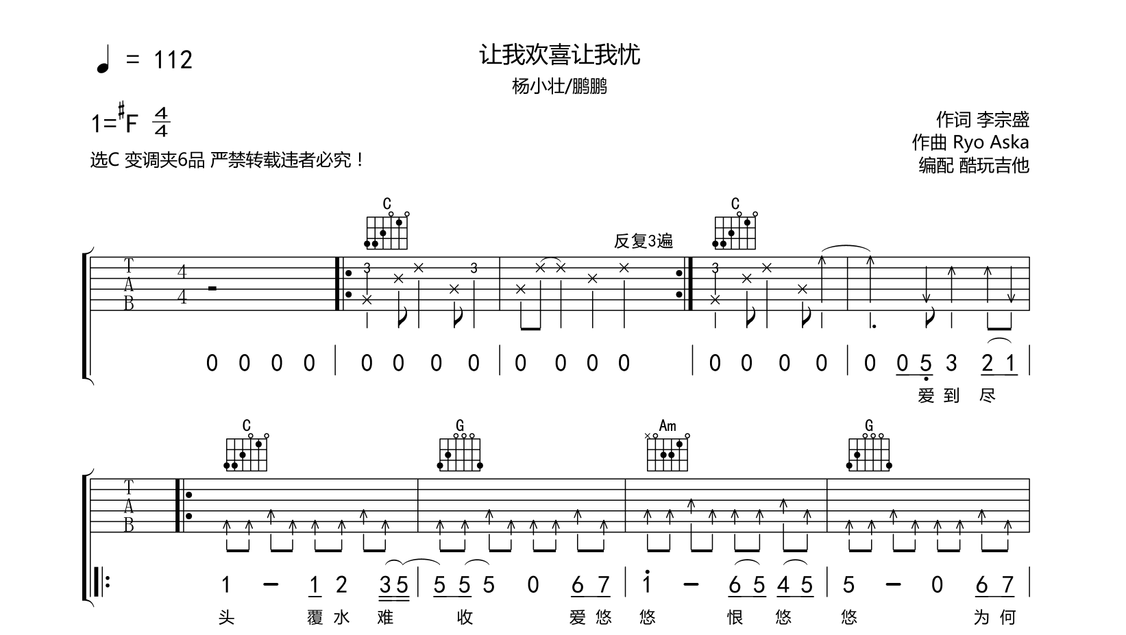 让我欢喜让我忧吉他谱-杨小壮碰鹏鹏-木吉他版选C变调夹6品原本选择五和弦强力和弦编配发现演奏起来手好累肯能就适合电吉他弹奏所以这里使用常用和弦便于演奏音频为手机录制只是录制部分以作试听前奏我没有重复自己弹奏请按谱子编配顺序...