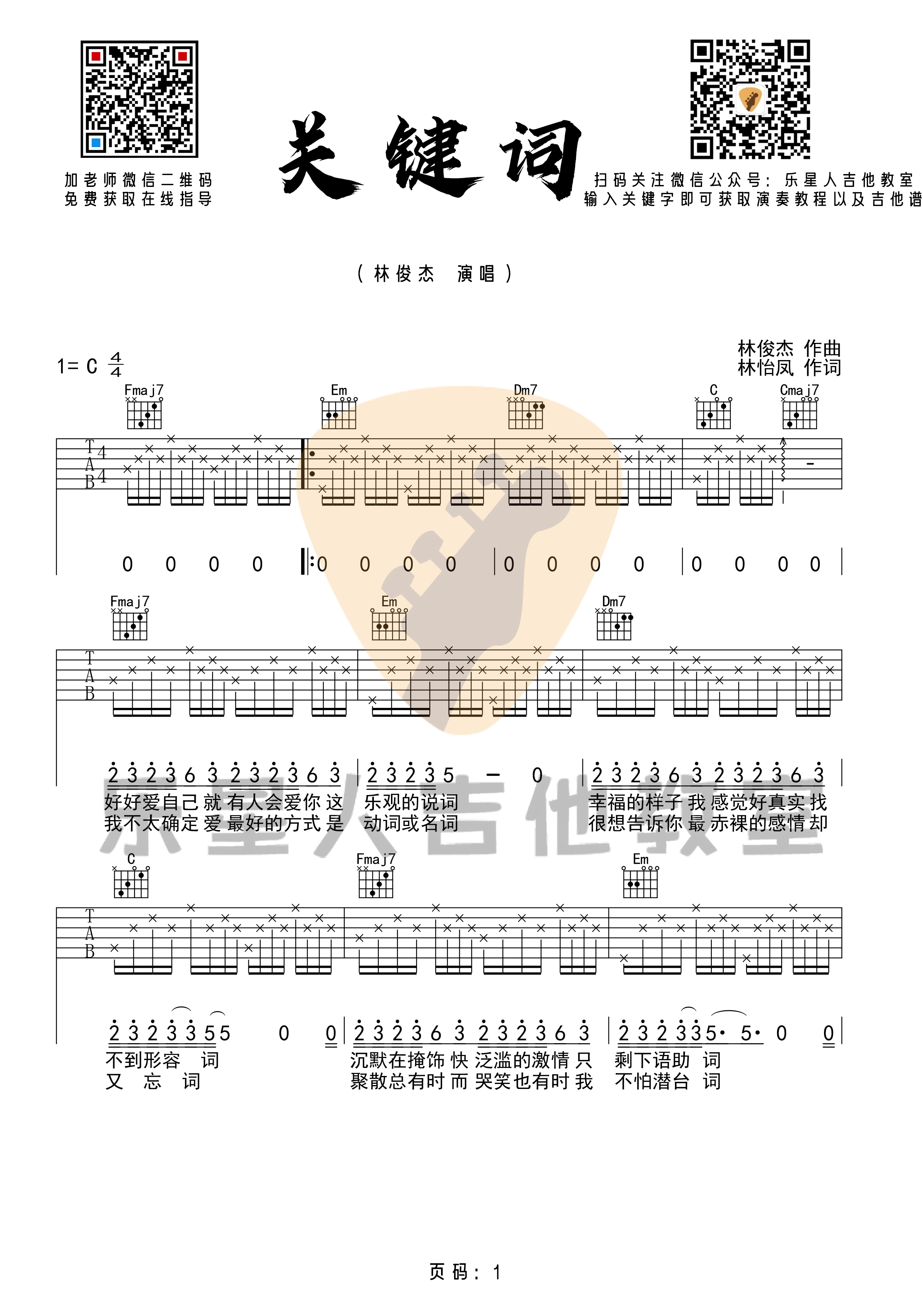 吉他关键词吉他谱-林俊杰初级简单版