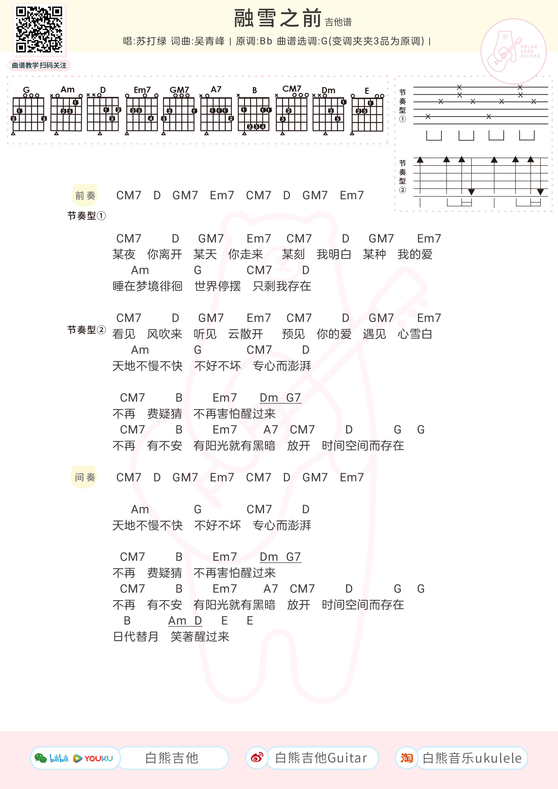 吉他苏打绿《融雪之前》吉他谱 G调和弦谱附节奏