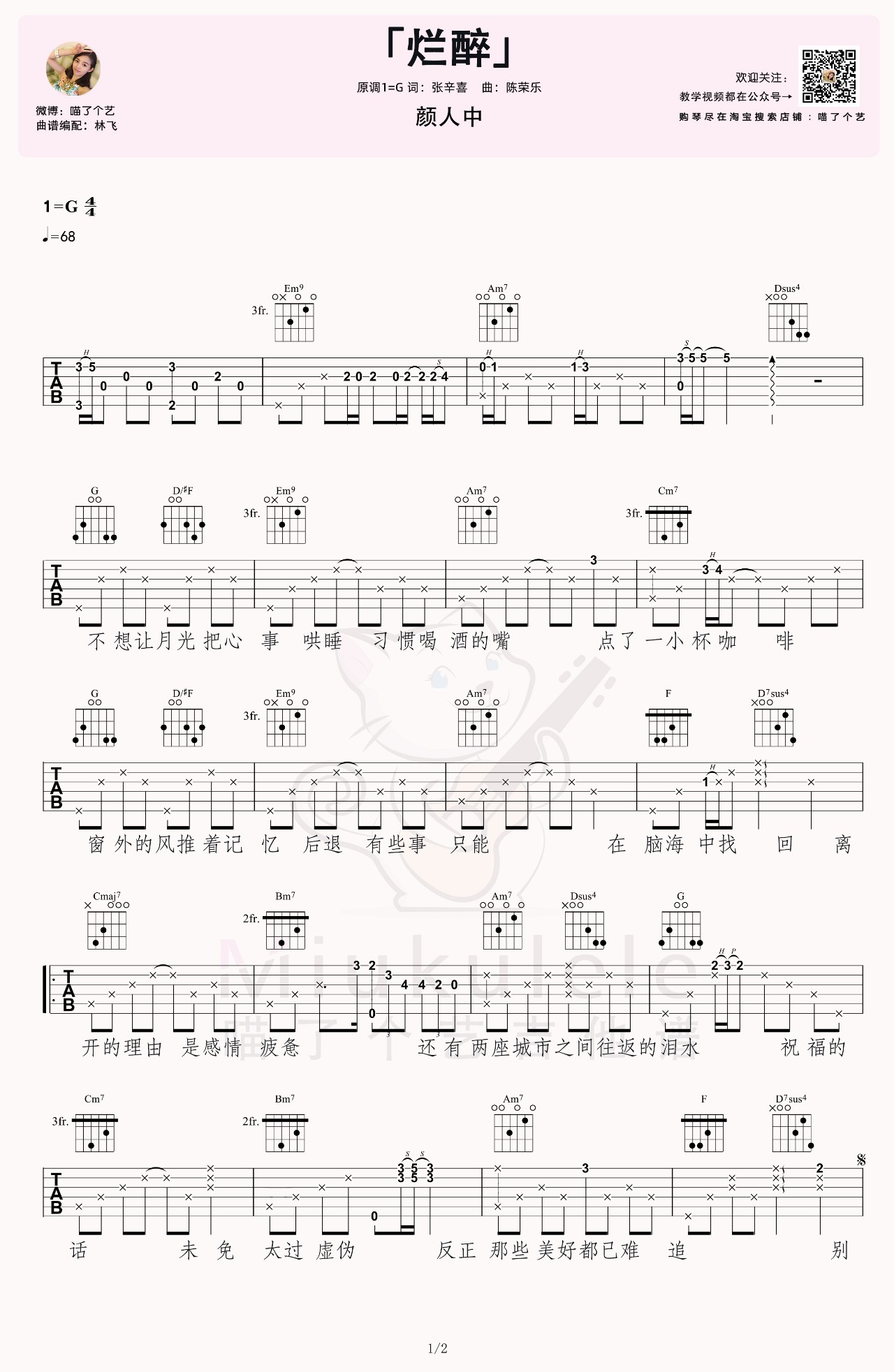 吉他颜人中《烂醉》吉他谱 G调弹唱谱