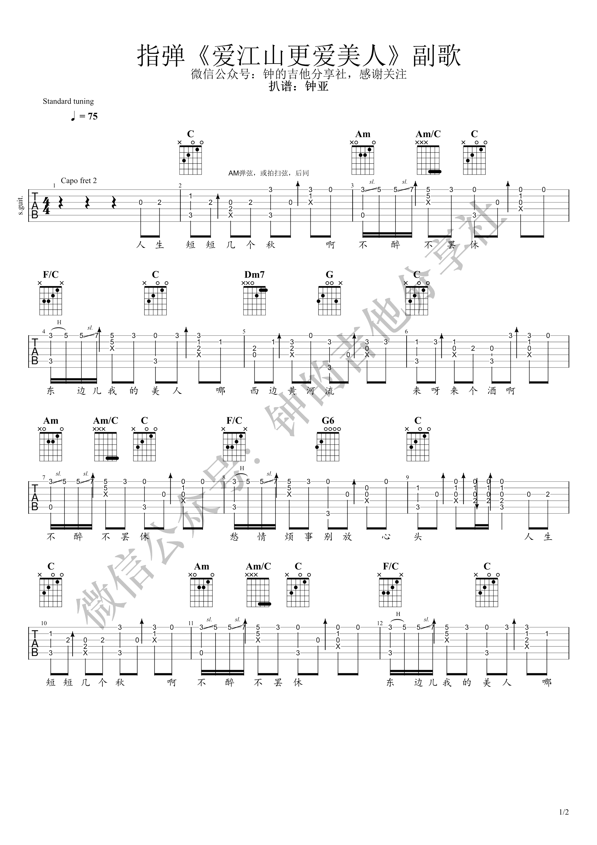 这首曲子钟亚老师只编了副歌部分,琴友们可以很好地训练AM技巧。歌曲D调,变调夹加2品C调指法编配,副歌和弦级数走向大体是:1-6-4-5,很常见。...
