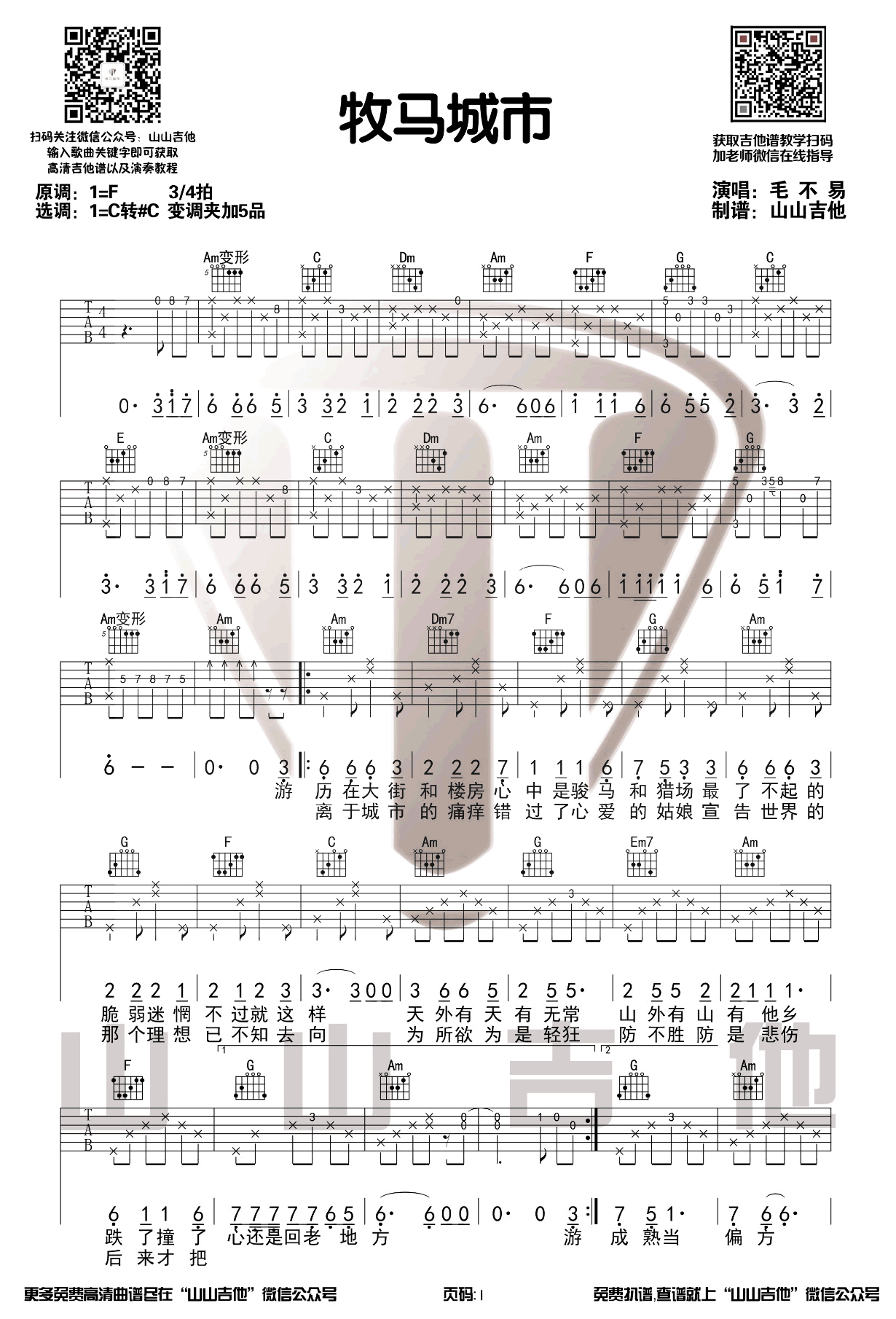歌曲原调F,选调C转升C,变调夹夹第五品。山山吉他制谱...