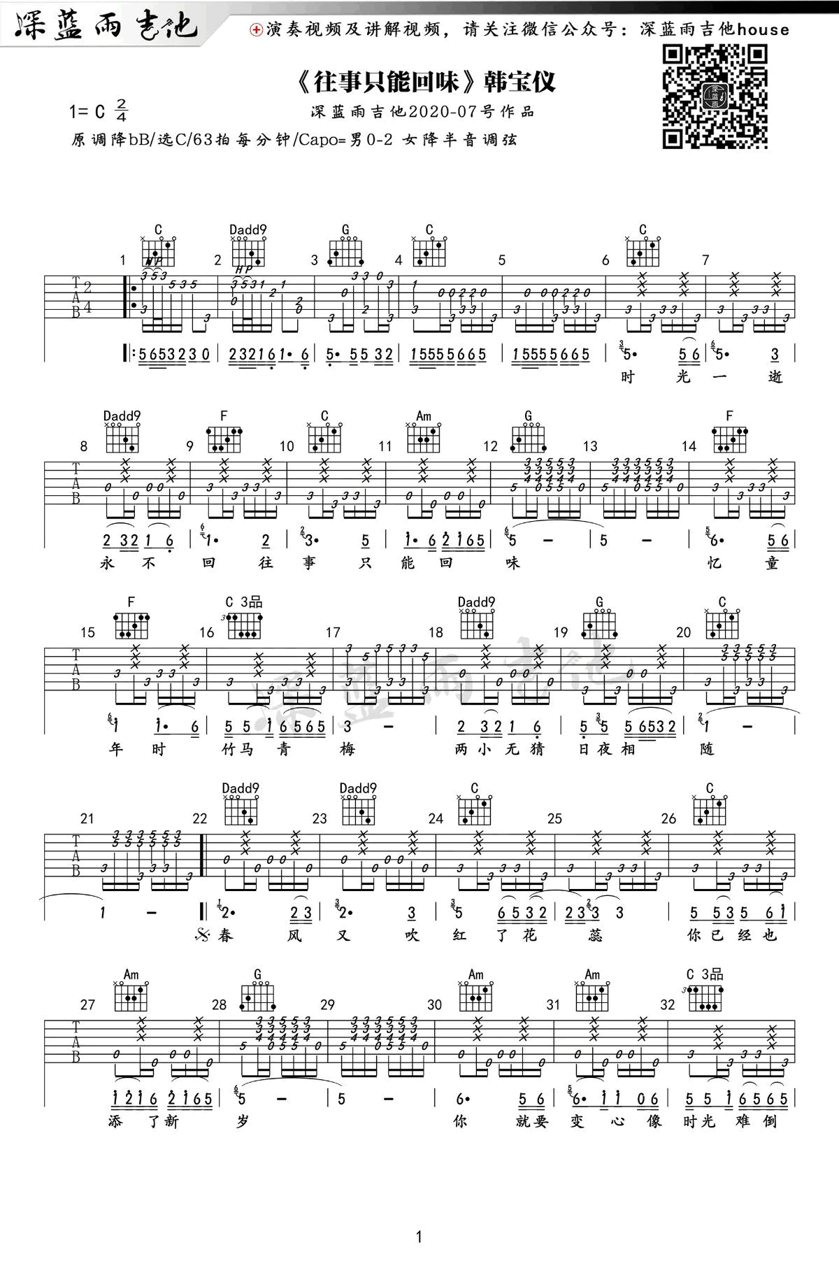 原调降B,选用C调指法,变调夹建议男生0-2品,女生降半音调弦。深蓝雨吉他出品...