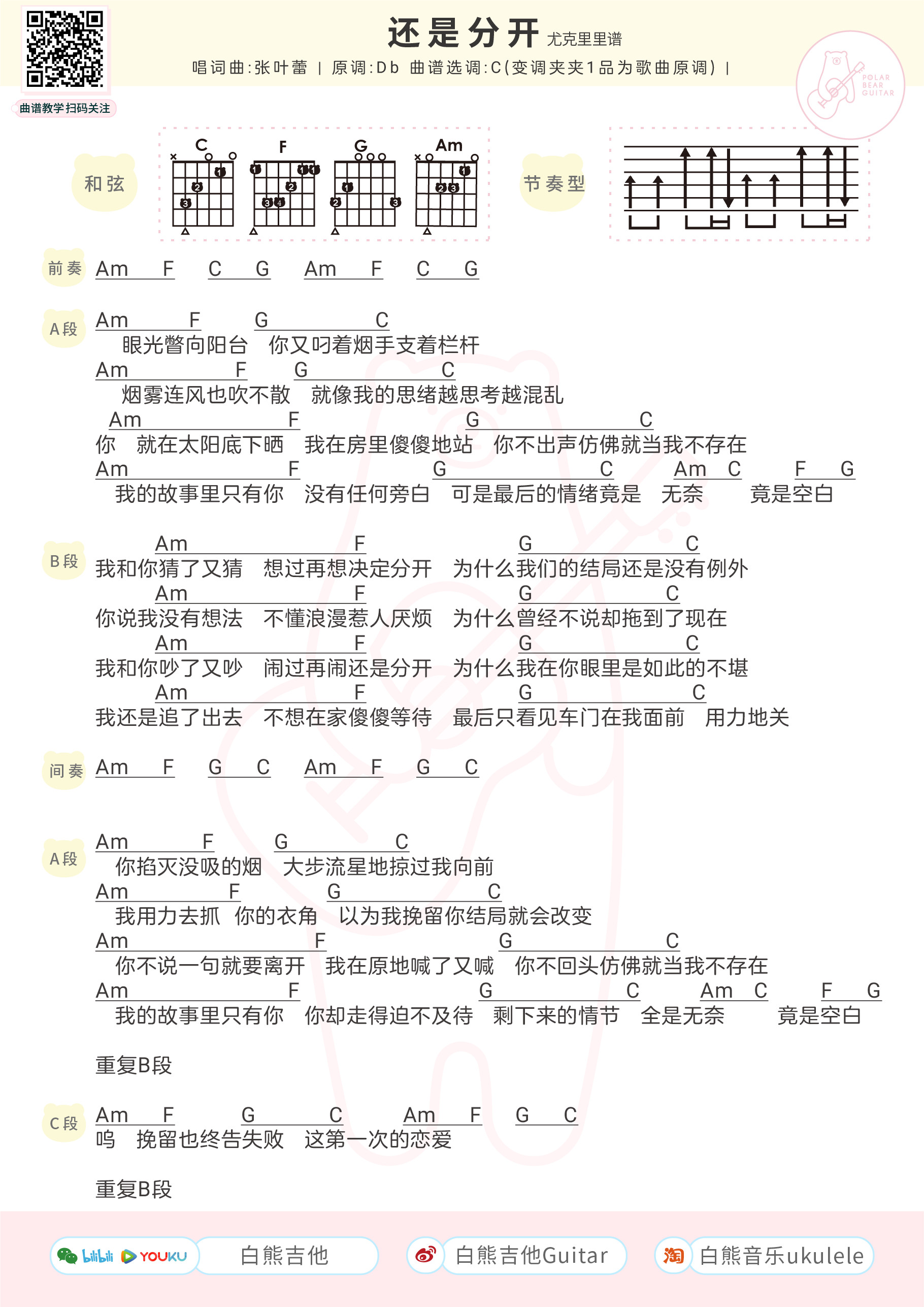 张叶蕾《还是分开》吉他谱C调和弦谱...